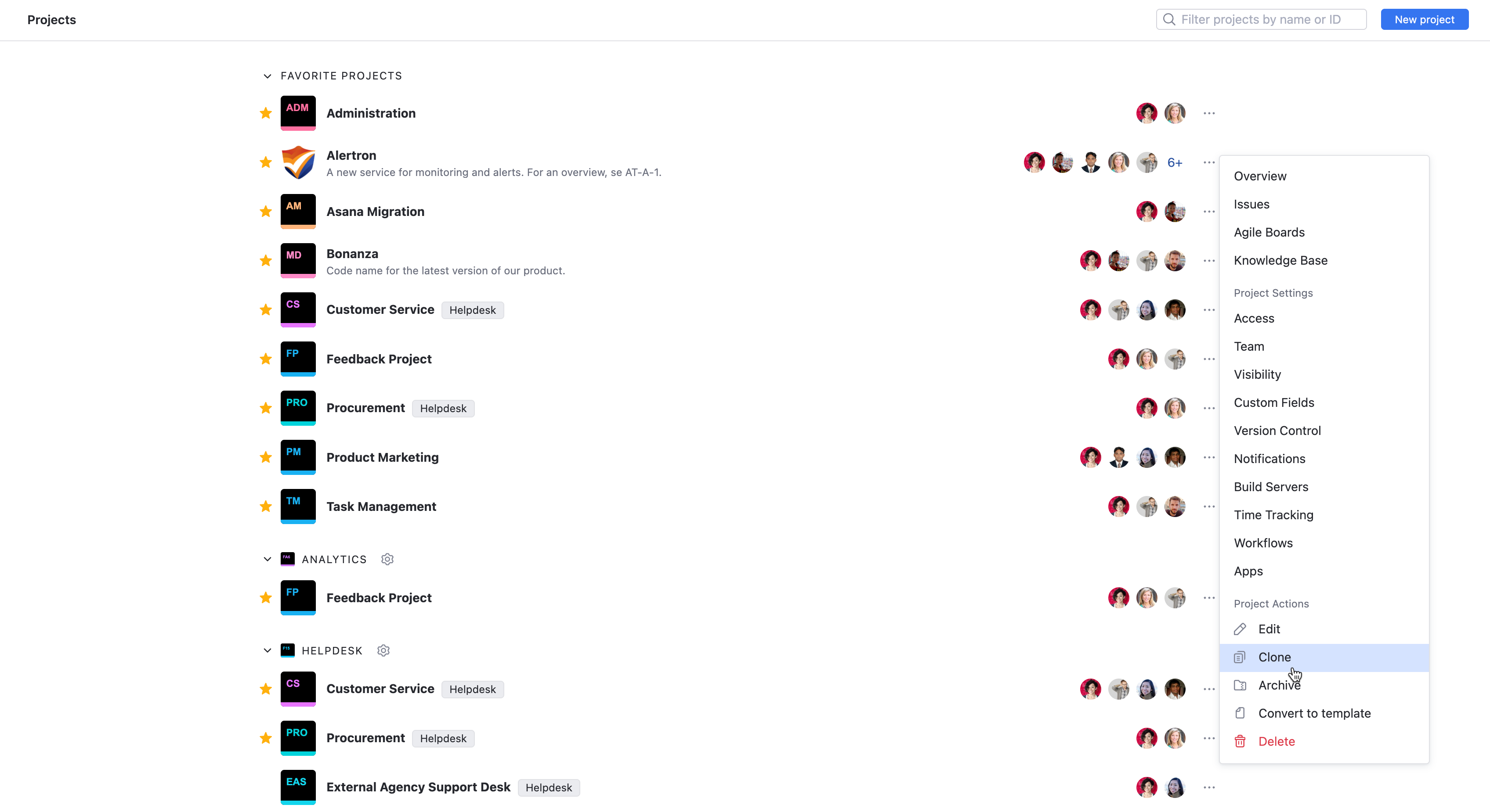 The Clone project action lets you create a project that is similar but not identical to an existing project. This operation lets you create new projects without having to configure them from scratch. Once you create the new project, you can modify its settings independently from the original project.