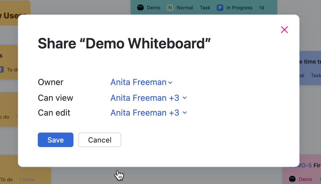 Permissions determine who can view or edit a whiteboard, providing flexibility to ensure it remains secure while allowing contributions from the right people. You can update access levels at any time to adapt to changing collaboration needs.