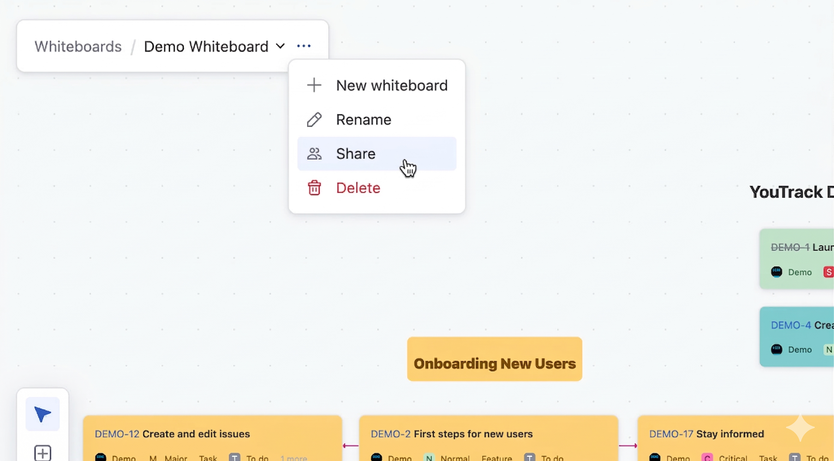 Whiteboards in YouTrack are for collaboration, allowing multiple users to contribute and make changes in real time. Whether it's brainstorming, planning workflows, or organizing tasks, whiteboards ensure that everyone stays aligned in a shared workspace.
