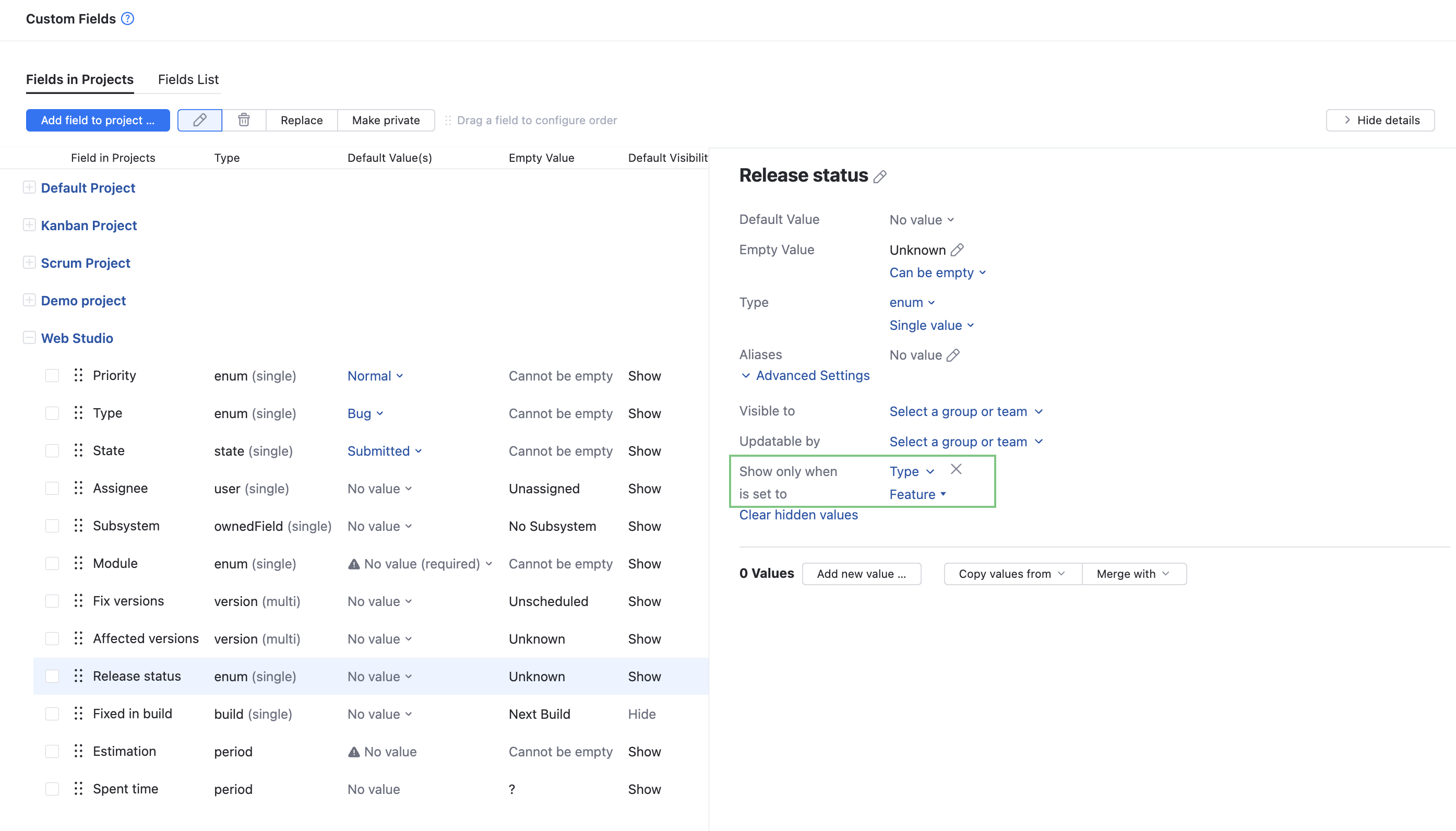 Conditions for showing custom fields can be set independently in each project. As an administrator, you can view and update these settings for all projects. To access these settings, open the Custom Fields Settings page and switch to the Fields in Projects tab.