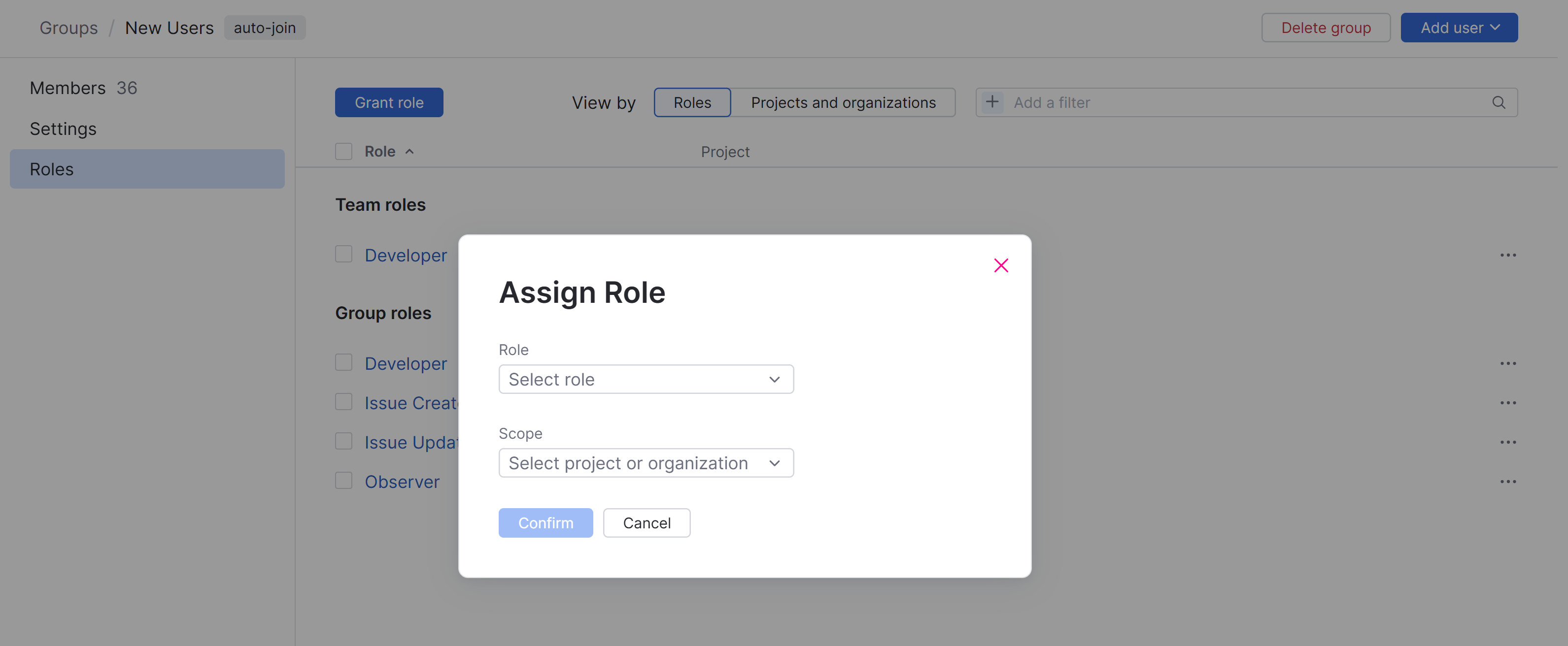 In the Assign Role dialog, choose a role to assign to the group.