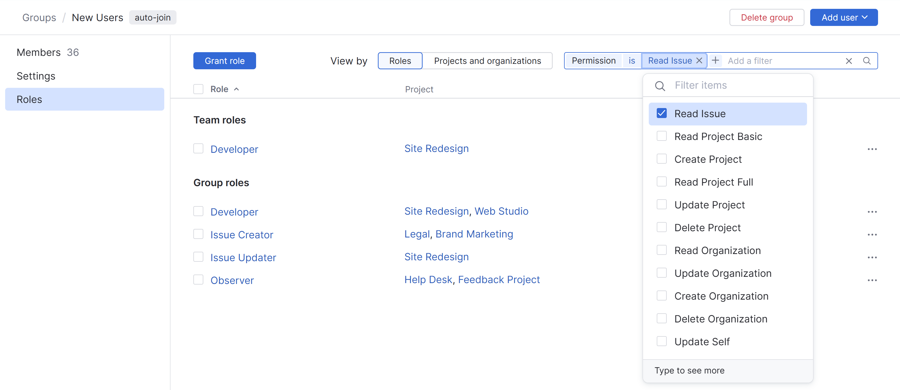 The Roles page in the group profile lets you view and manage the permissions that are available to the members of a group. It provides a centralized view of available roles, their scope, and the projects or organizations where they apply. Group members inherit permissions based on the roles that are assigned to the group in one or more projects.