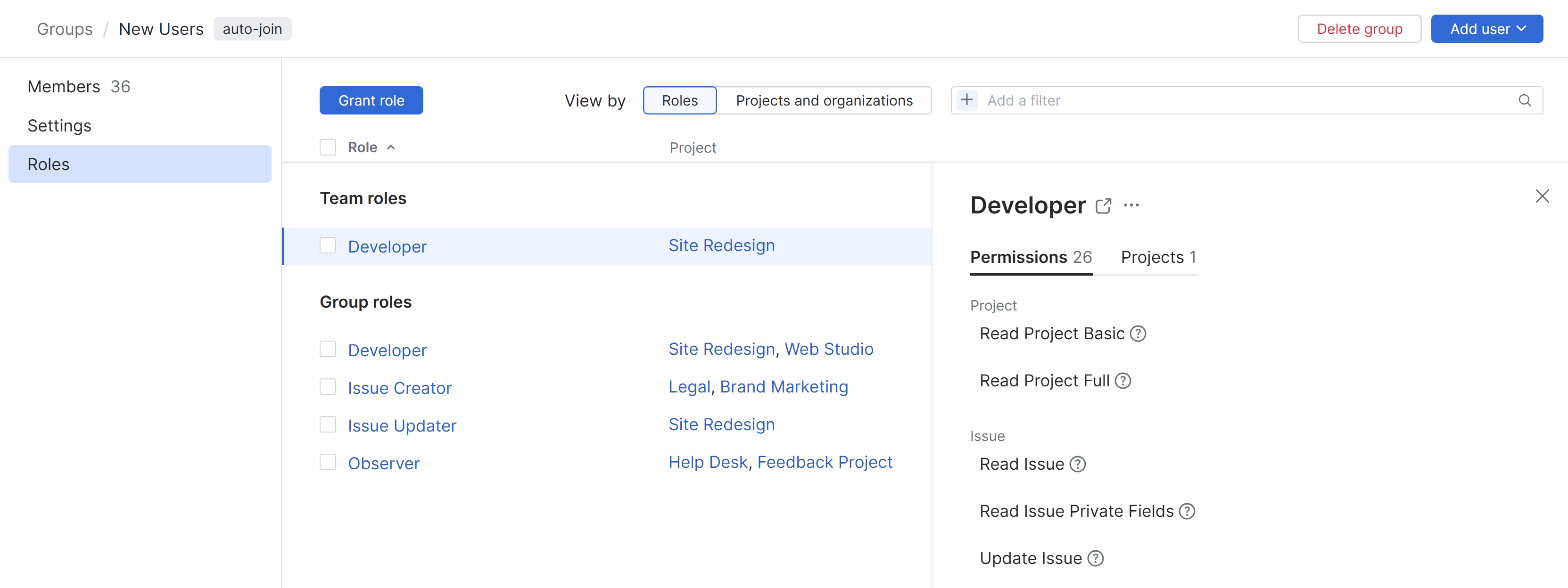 The list displays each role assigned to the group and the projects in which the group is granted this level of access.