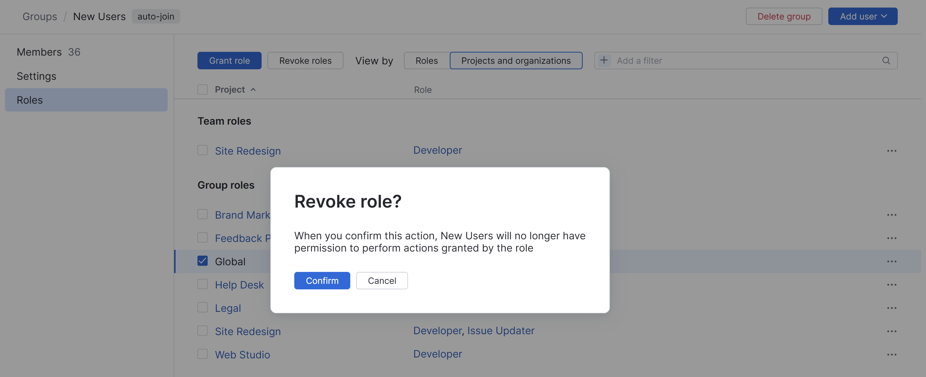 Locate the role assignment that you want to remove from the selected group. Use the search box to locate a role by name, project, or permission.
