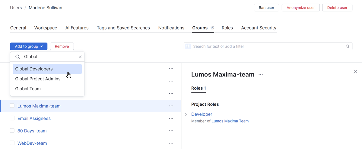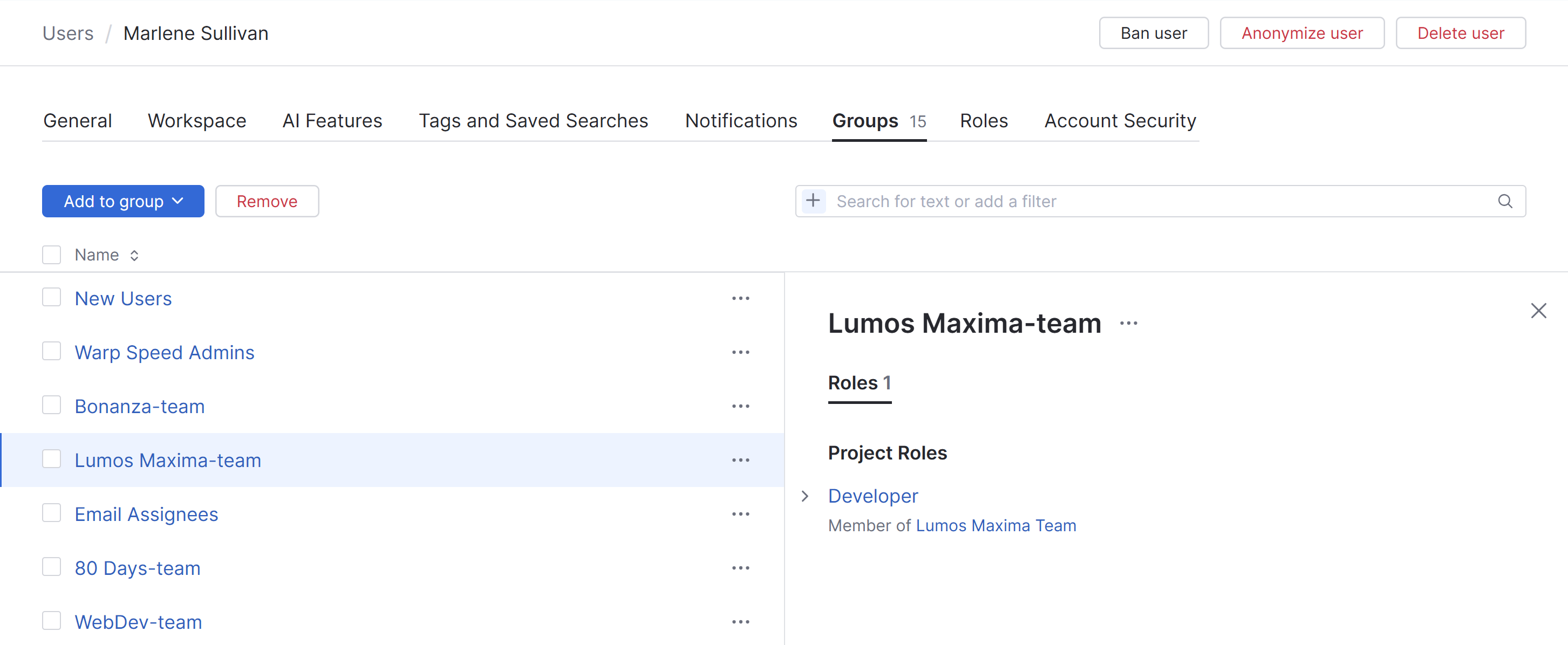 To view and configure group membership for a user account, open the Groups tab of the account profile.