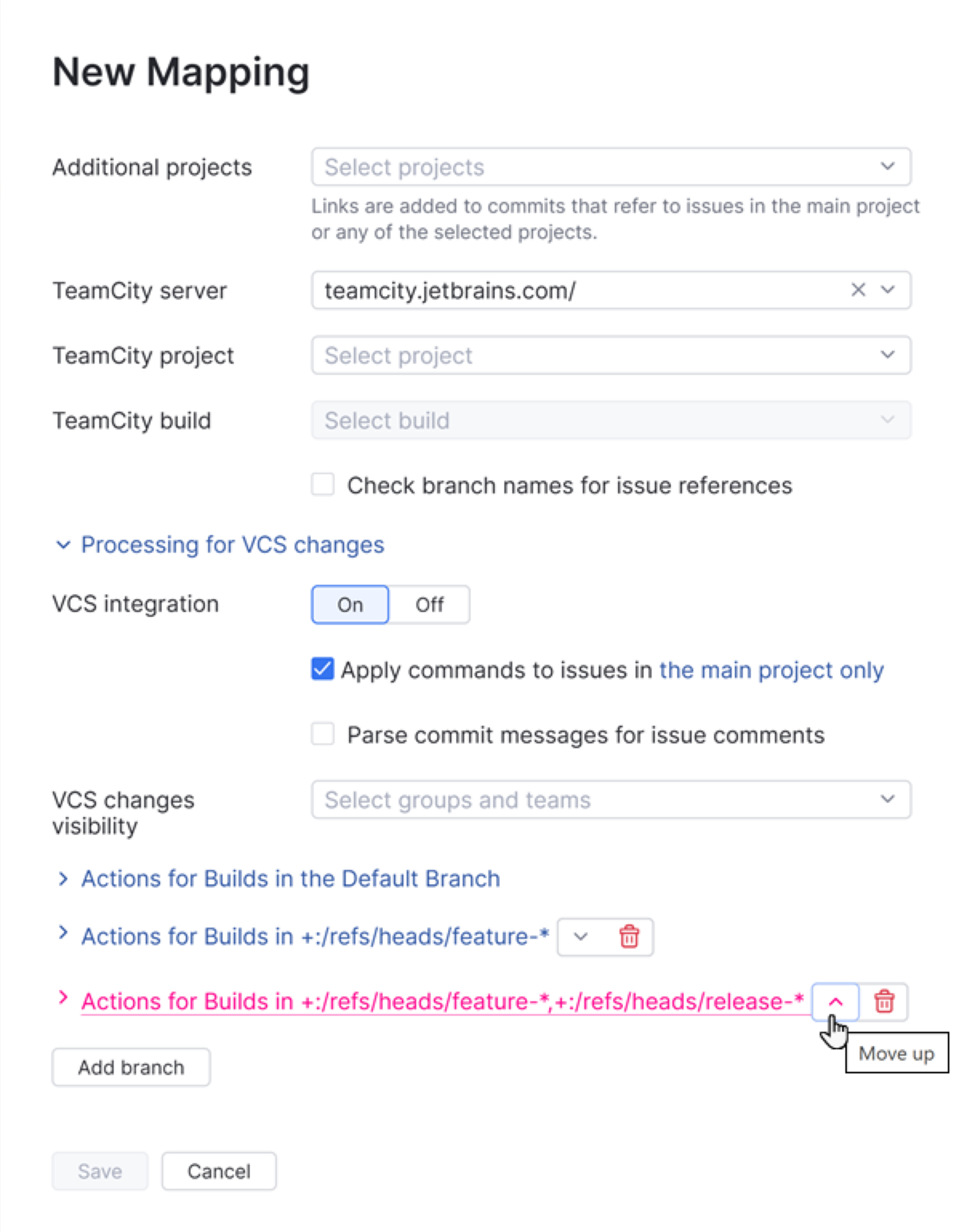The following options are available in the Actions for Builds section of the New Mapping settings for a build server integration. TeamCity integrations support separate actions for an unlimited number of branches.