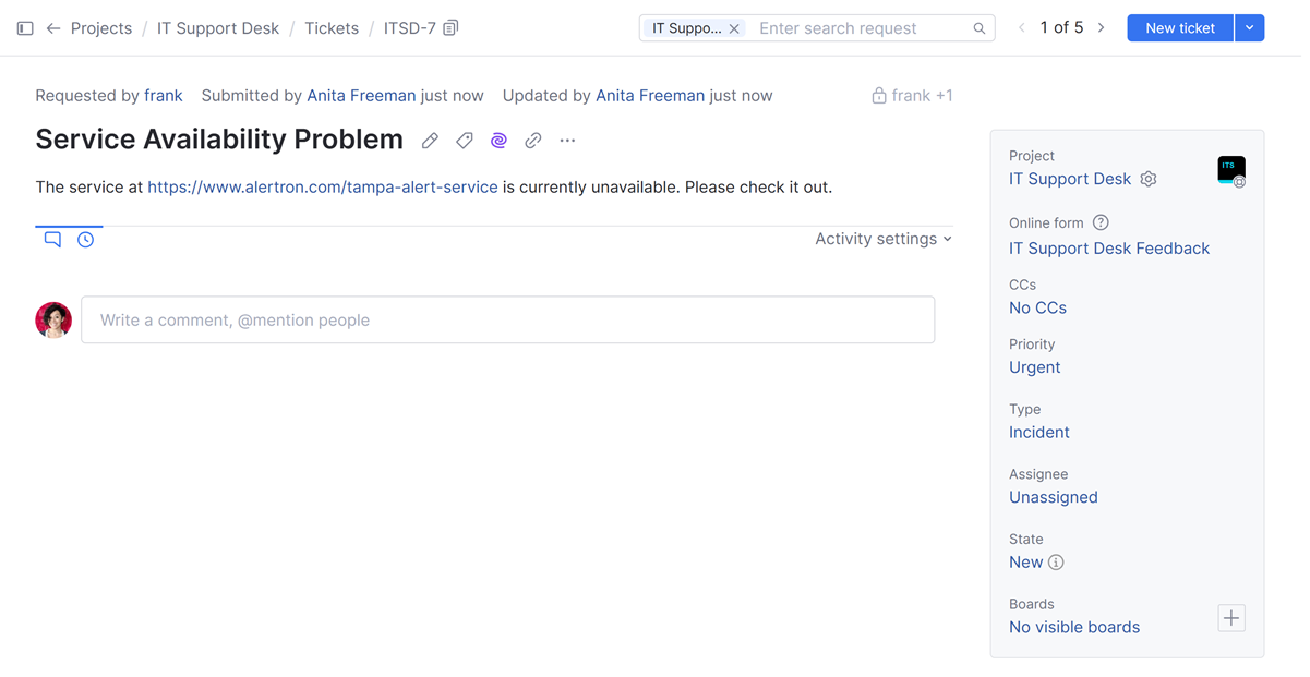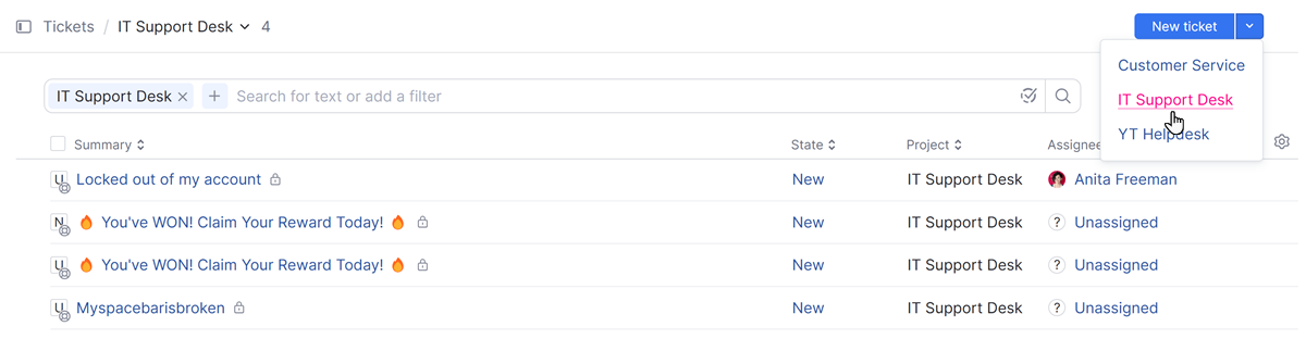 Helpdesk agents can create tickets on behalf of other users in YouTrack. This option comes in handy when an agent receives feedback from someone through an external channel, for example, in a direct email or in a conversation.