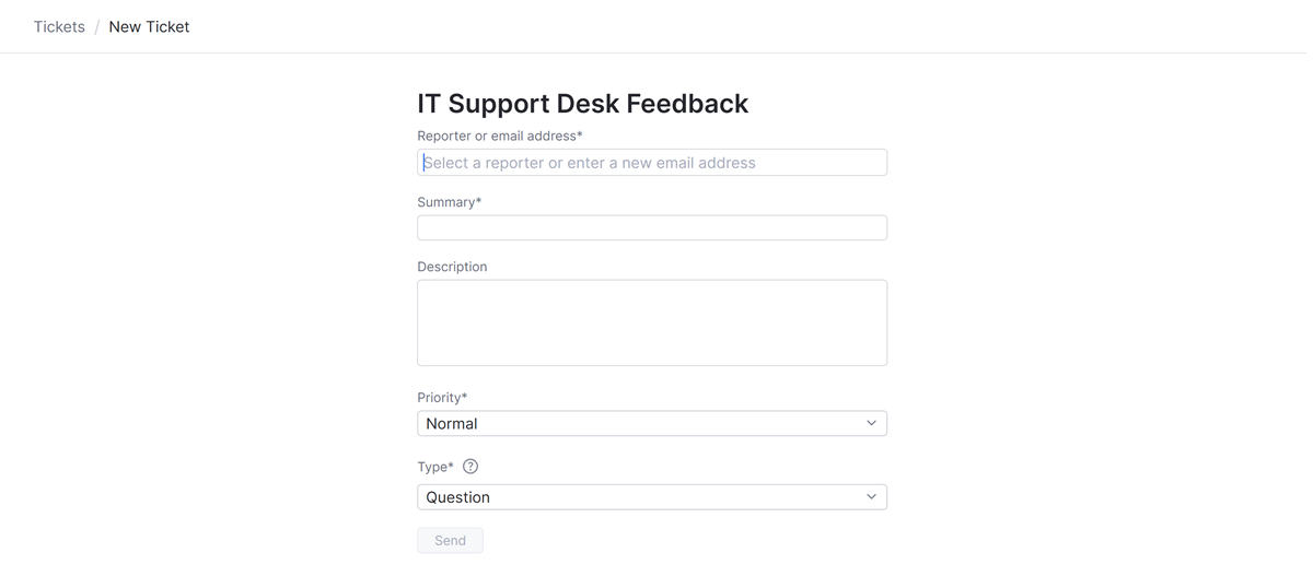 Open the dropdown menu to the right of the New ticket button in the header and select the form for creating a ticket.