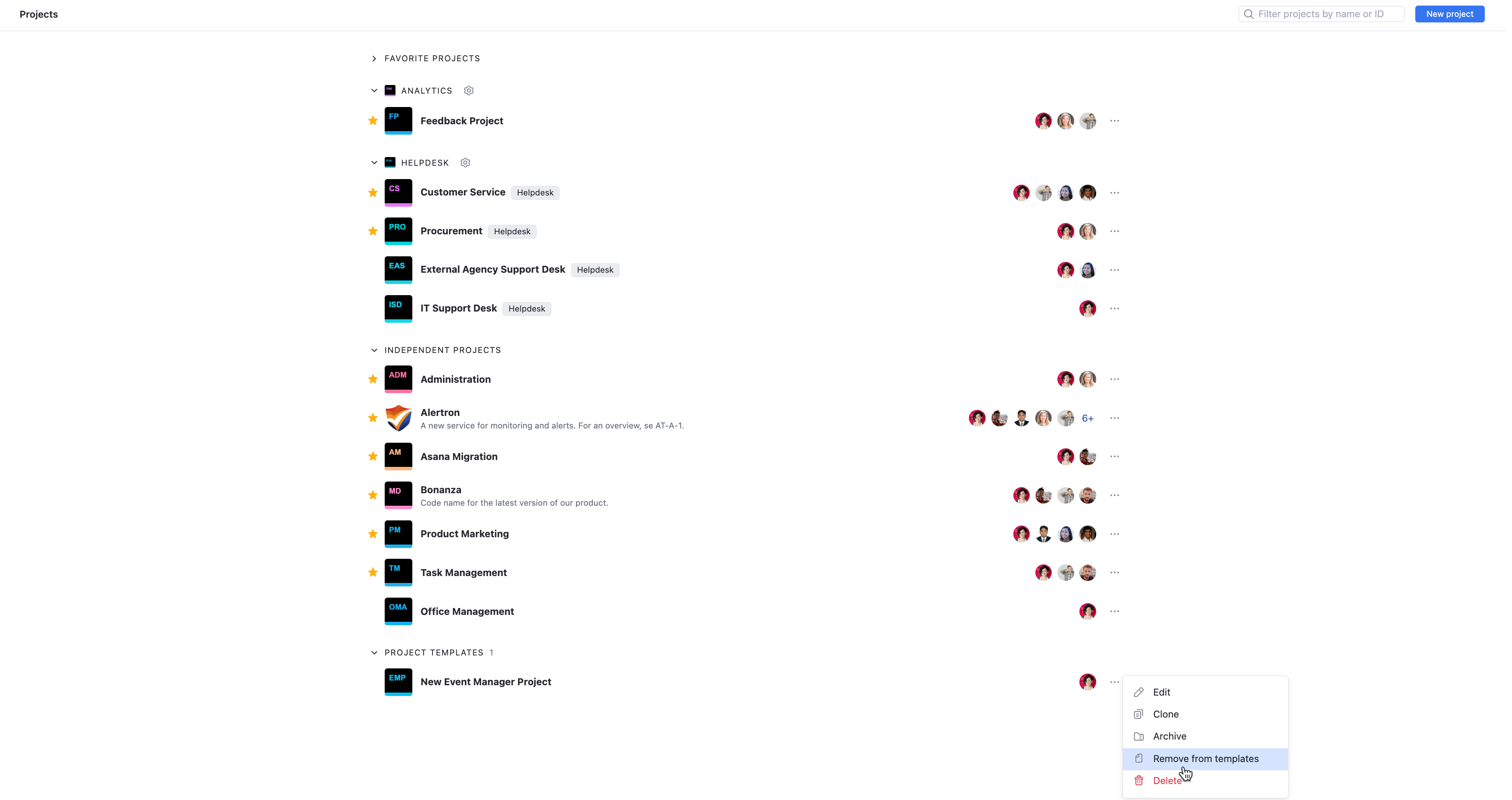 More menu for the project template that you want to remove, and select