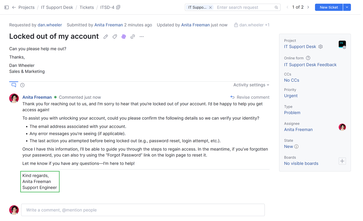 Using a default signature ensures that every email sent by the representative includes consistent and professional contact information. This can help to build trust with customers and establish a strong brand image. It also means that agents don't have to manually add contact information to every comment they post, which saves time.