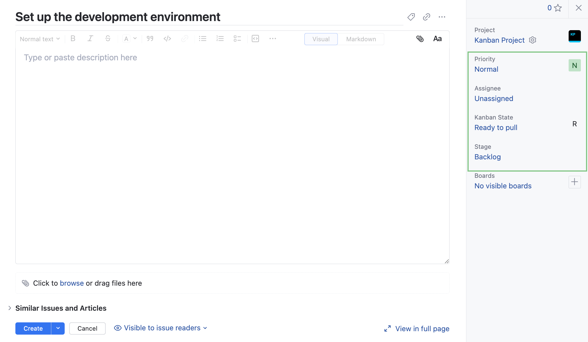Stage | Used to manage the lifecycle of an issue. The set of values that are used for the Stage field has an additional Resolved property. The general idea is to move an issue from one stage to the next until the issue is resolved. In a project that follows the Kanban development methodology, these stages are represented as columns on the agile board and can also be associated with specific departments or teams. The following set of values is pre-configured to represent unresolved states: