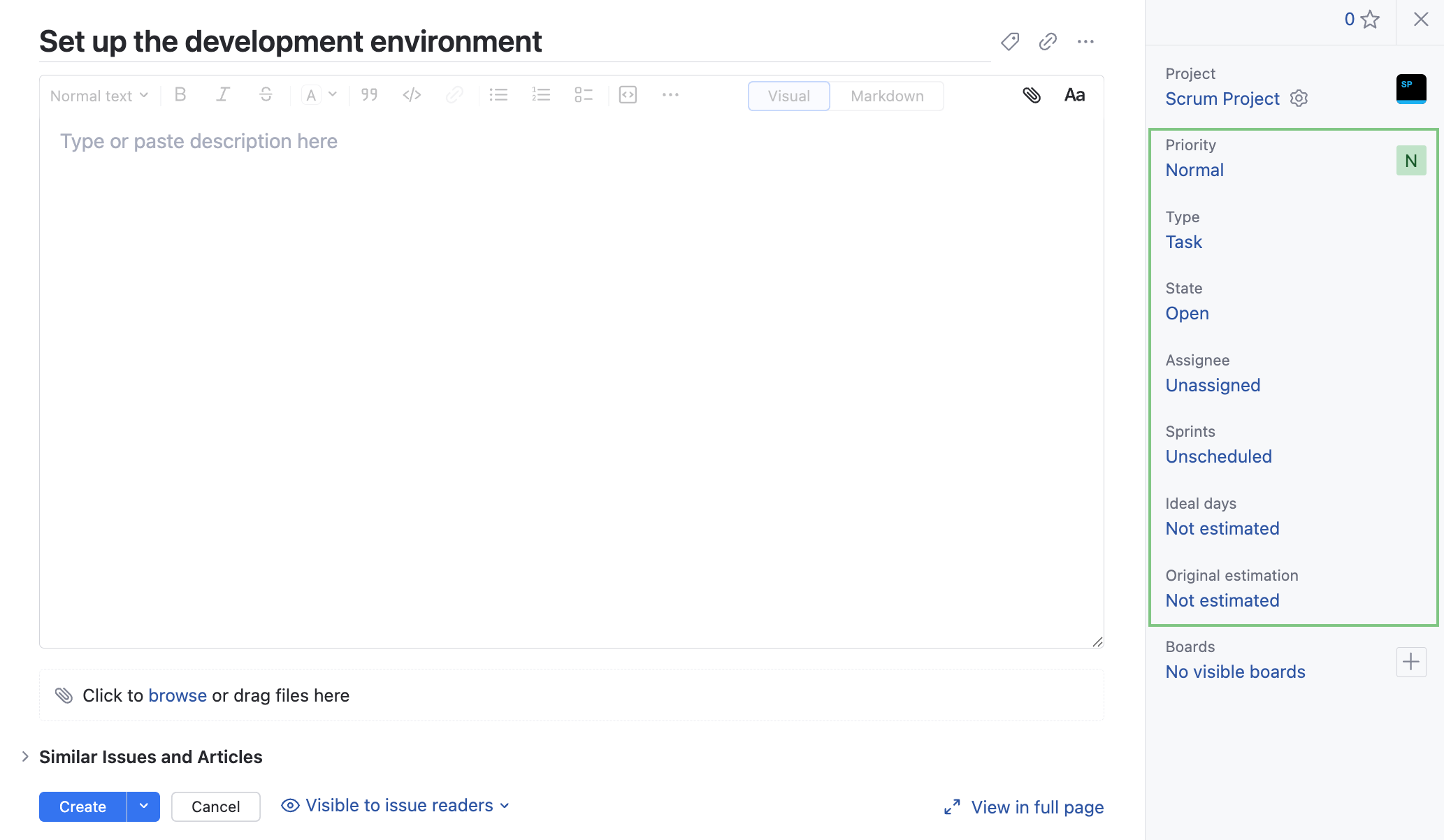 State | Used to manage the lifecycle of an issue. The set of values that are used for the State field has an additional Resolved property. The general idea is to move an issue from an unresolved state to a resolved state. In a project that follows the Scrum development methodology, these states are represented as columns on the agile board. The following set of values is pre-configured to represent unresolved states: