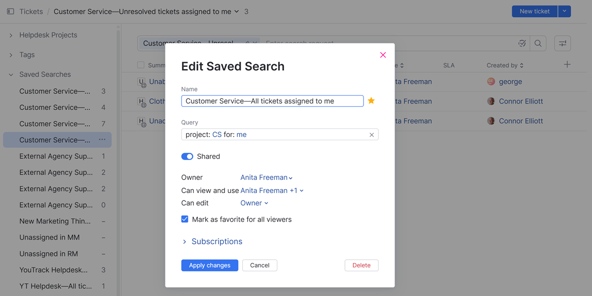 These queries are designed to satisfy the basic needs for agents in helpdesk projects. If you decide to refine these queries by adding additional filters or parameters, you can do so at any time. Updates to the saved searches are only applied to the queries for your account. Similar queries for other agents in the helpdesk project are unaffected.