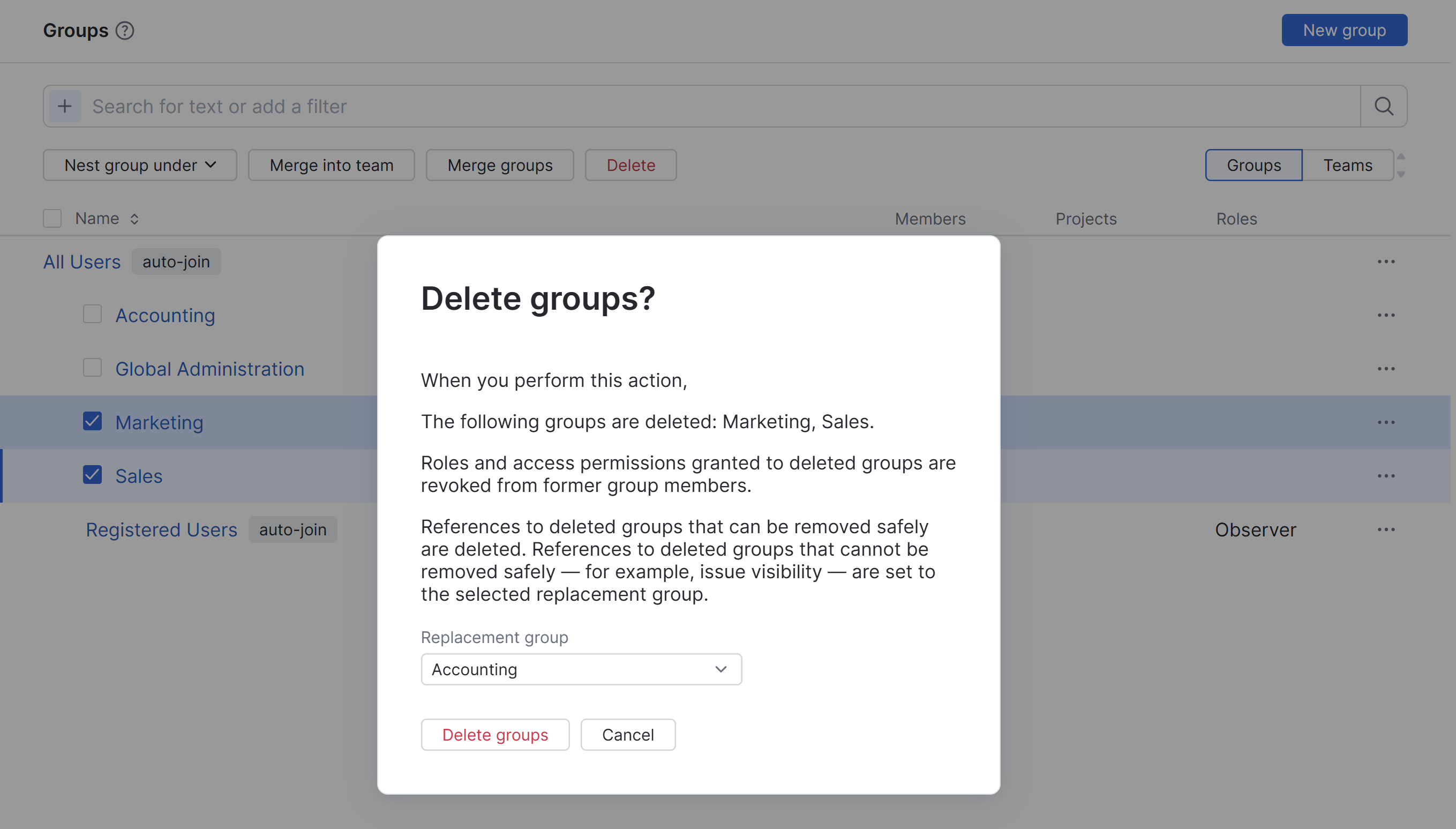 References to the deleted group that set visibility for issues in a project are set to the selected replacement group.