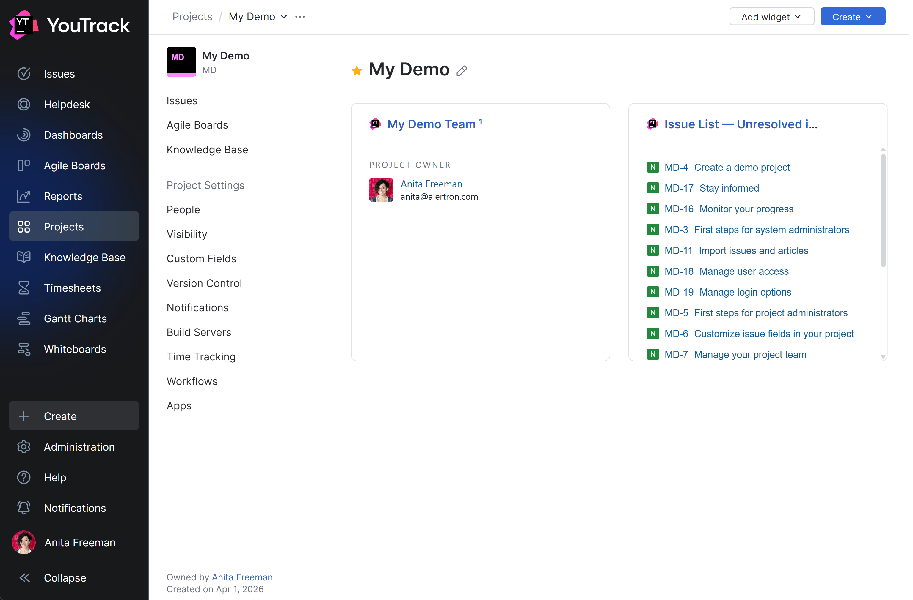 The demo project contains a preconfigured set of sample issues that help you become more familiar with key features in YouTrack. The demo project also includes a collection of agile boards, reports, and a dashboard.