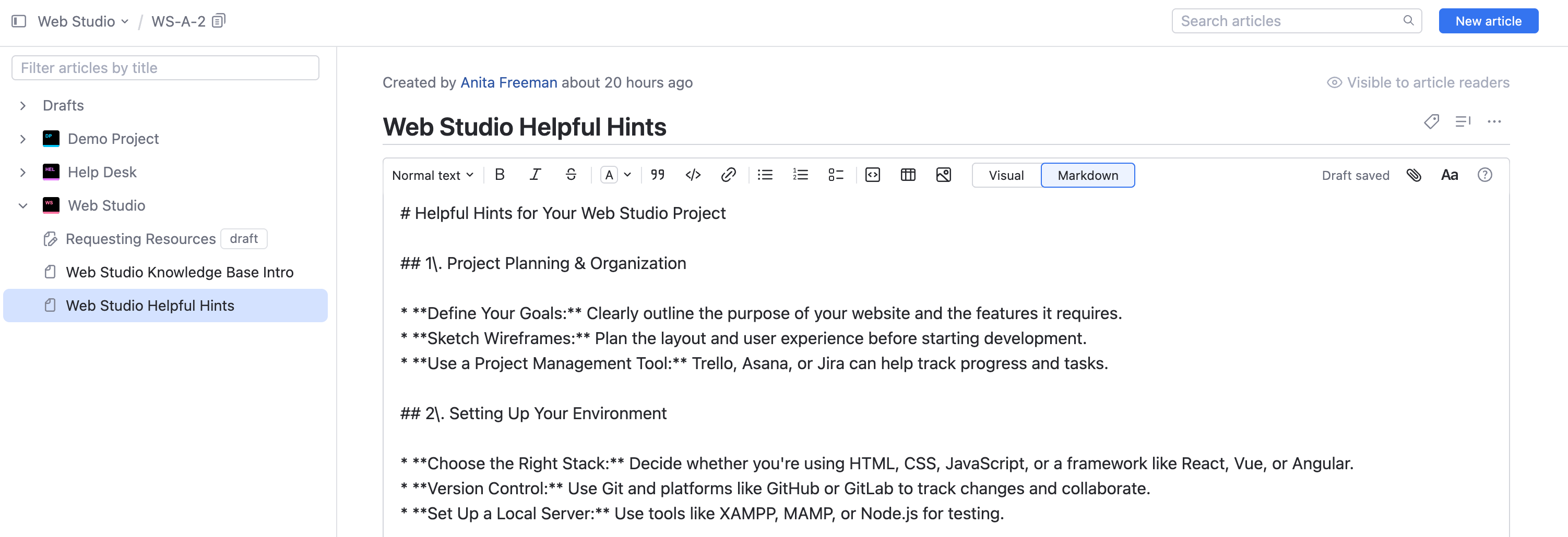 If you're not familiar with Markdown syntax, it may be hard to predict what your article will look like when published. For a quick preview that shows you what the article will look like when published, you can switch to Visual mode whenever you want. You can continue to edit the content in either mode according to your personal preference.