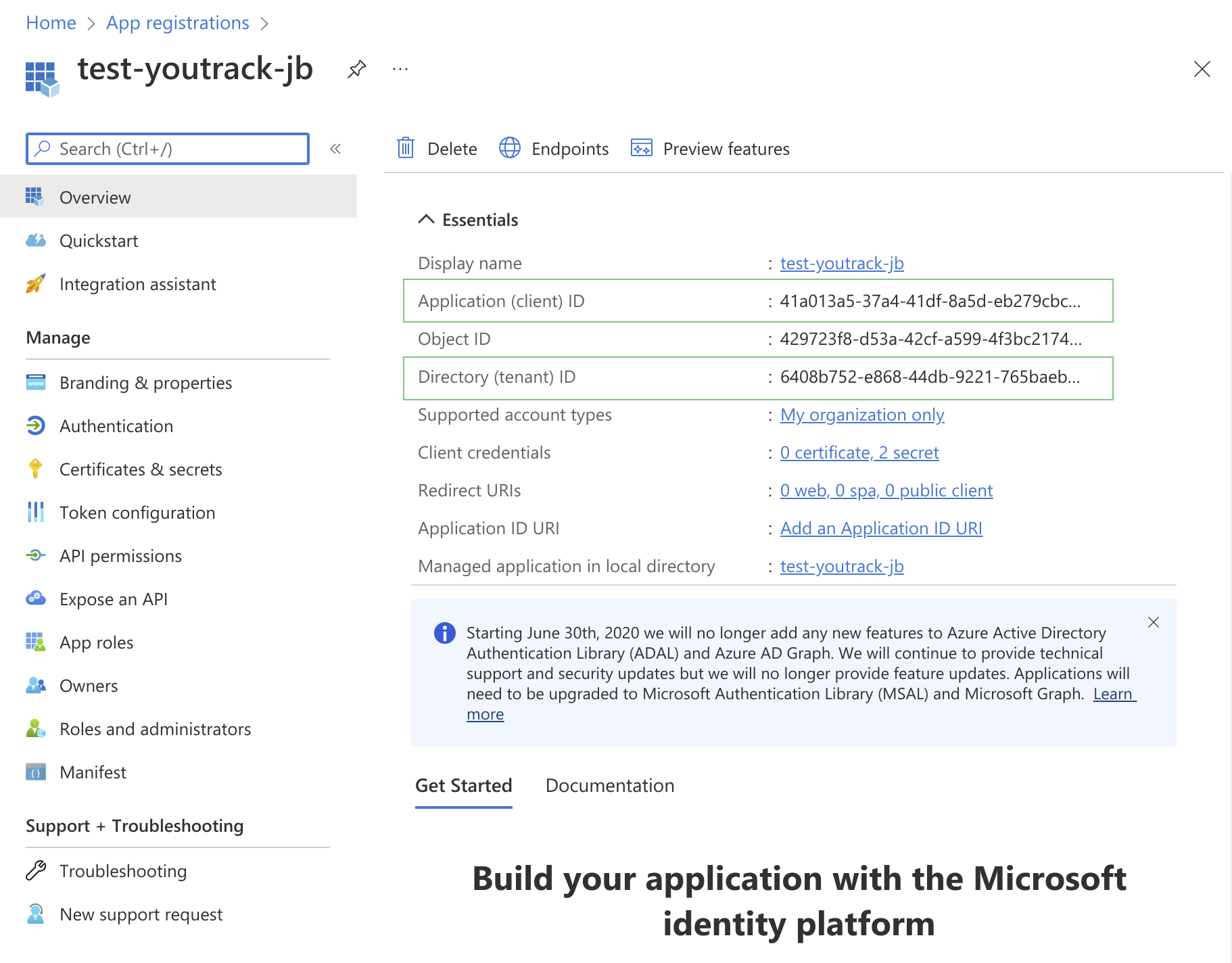 The Application (client) ID and Directory (tenant) ID can be found in the Essentials section of the client application as shown below.