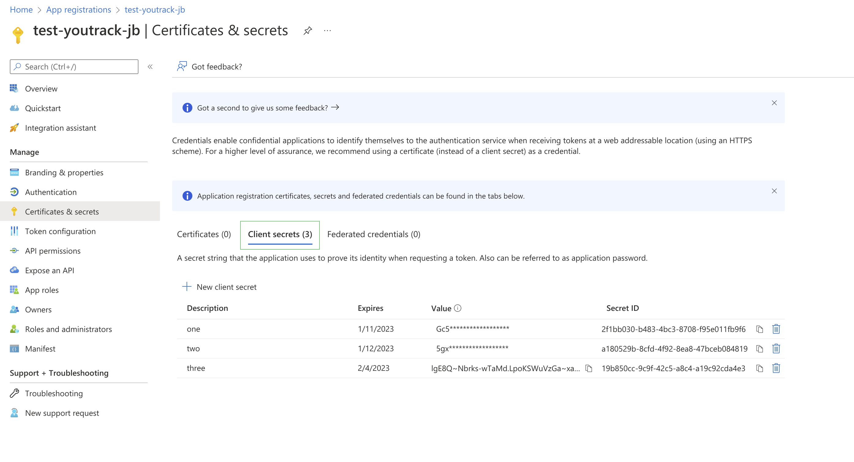 The client secret can be generated from the Certificates & secrets < Client secrets section.