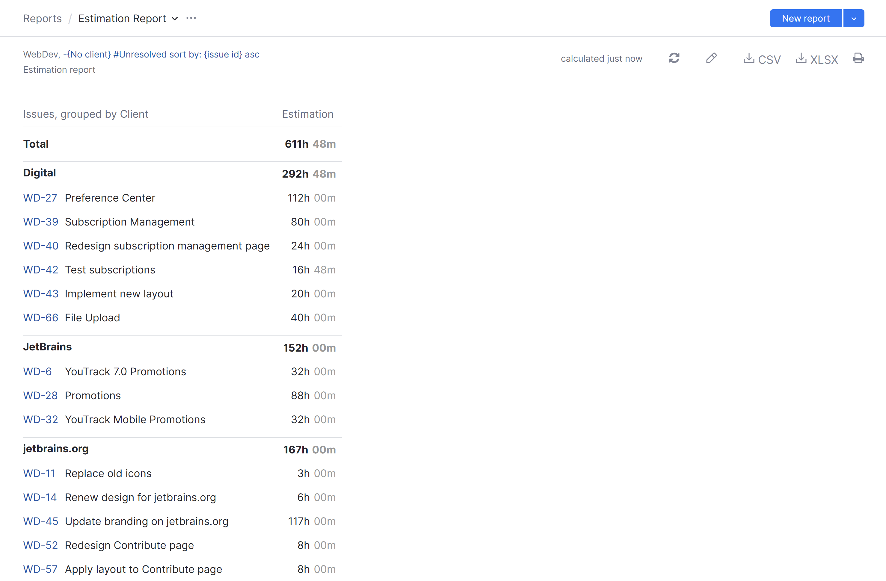 A report with the following settings displays estimations for all unresolved issues in the WebDev project. Estimations are stored as period values in the Estimation field. The report is grouped by values from the Client field. Issues that do not contain a value in the Client field are excluded from the report. Issues in each group are sorted by issue ID.