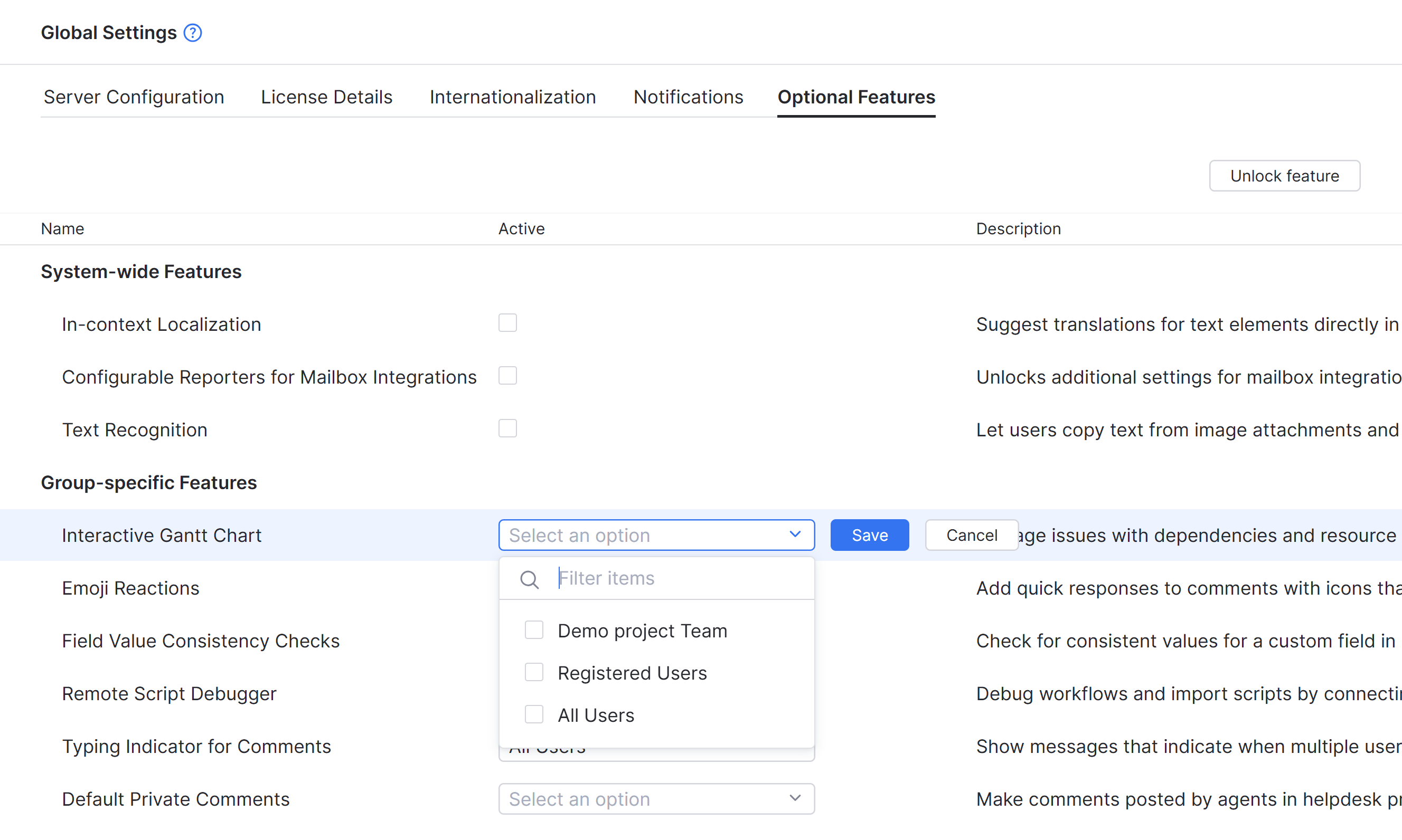 Optional features include functionality that may be useful in specific situations and disadvantageous in others. To make sure YouTrack is optimized for the needs of your teams and their business logic, we give you the ability to make these features available to specific groups or simply turn them off completely.