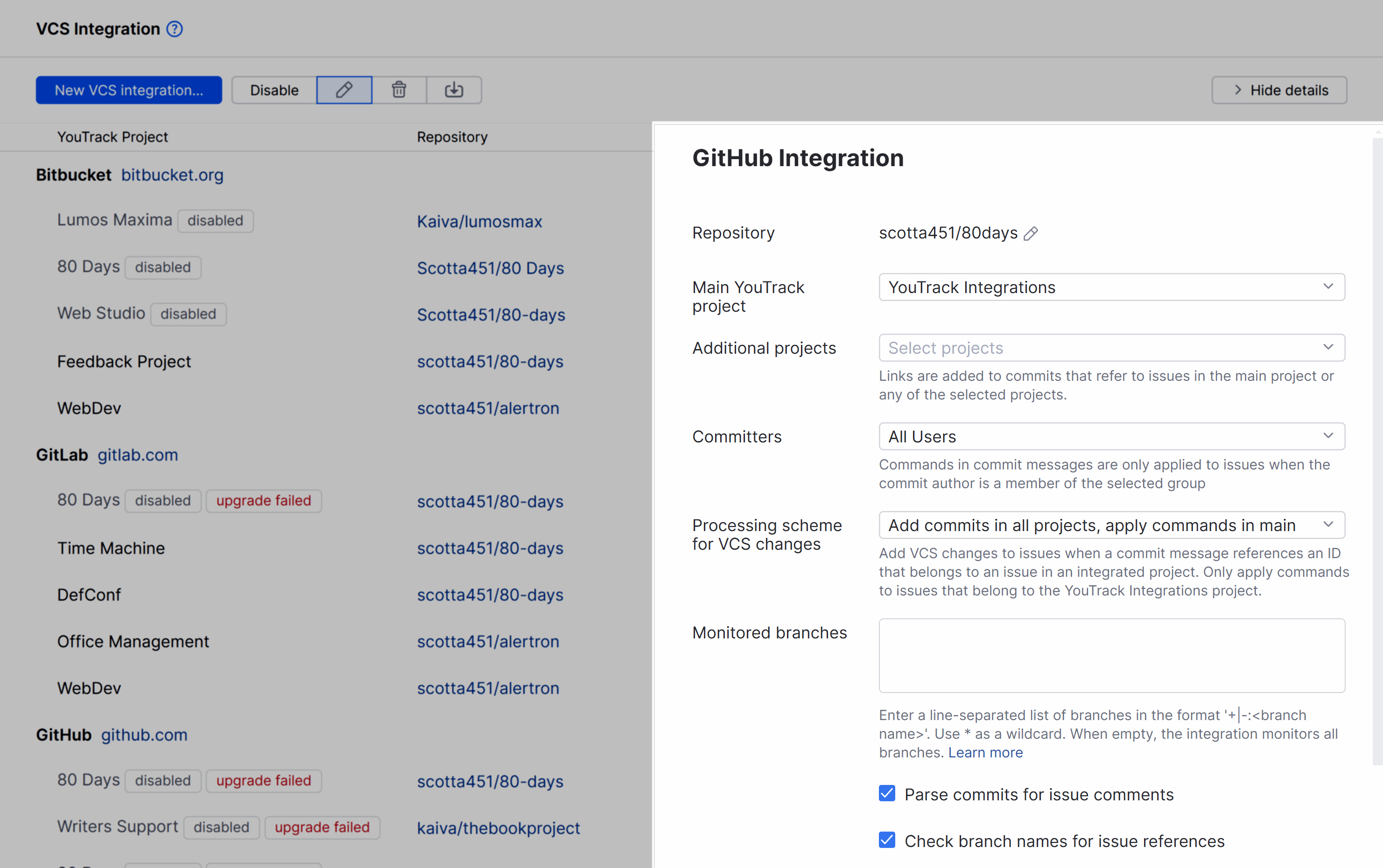 If you only want to process changes by specific users in designated branches or restrict the visibility of VCS changes in YouTrack, you can customize the integration settings. Use the following settings to customize the integration: