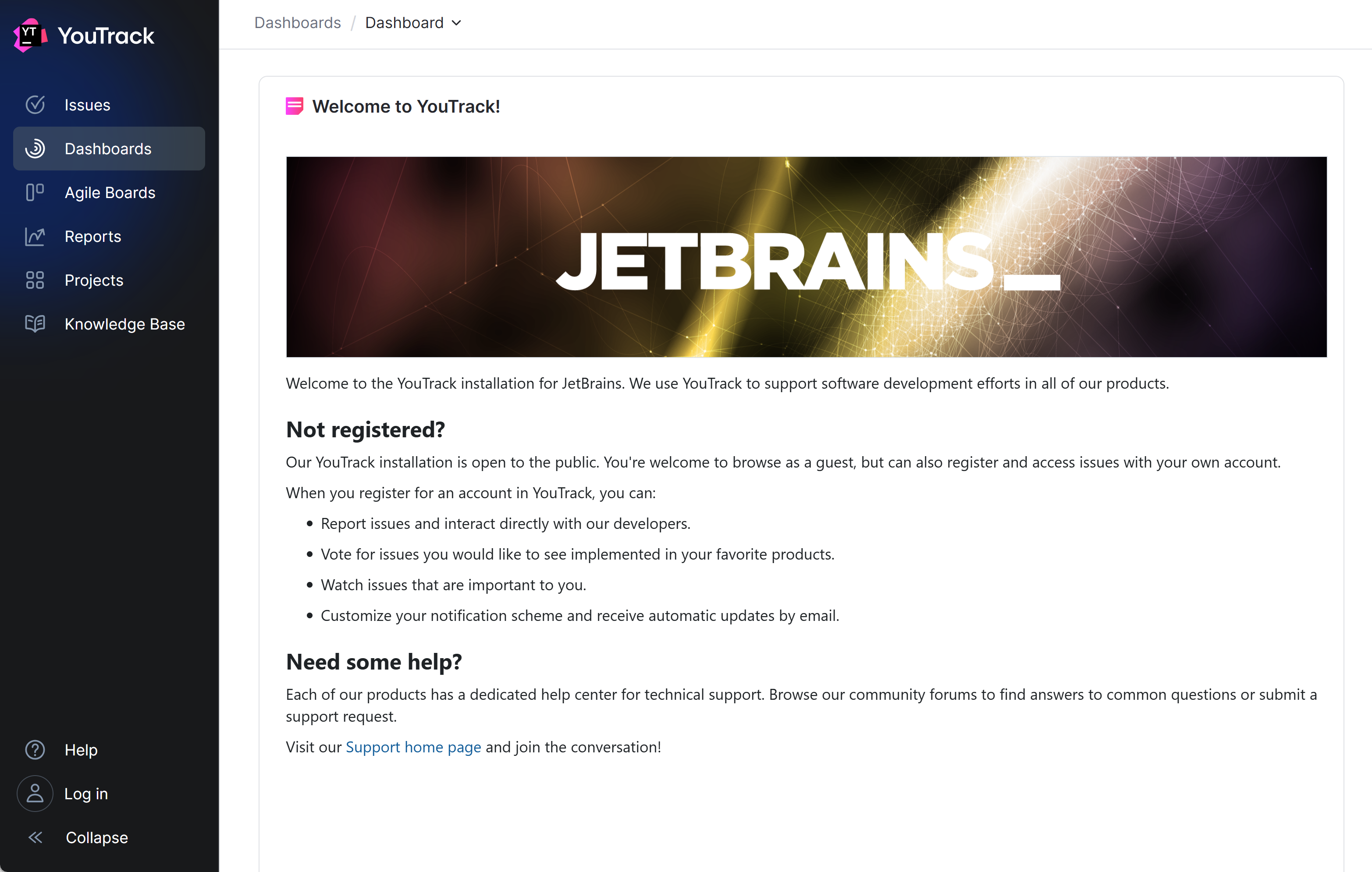 We use a Markdown Notes widget to inform visitors that they can register their own accounts and have direct access to our issue tracker.
