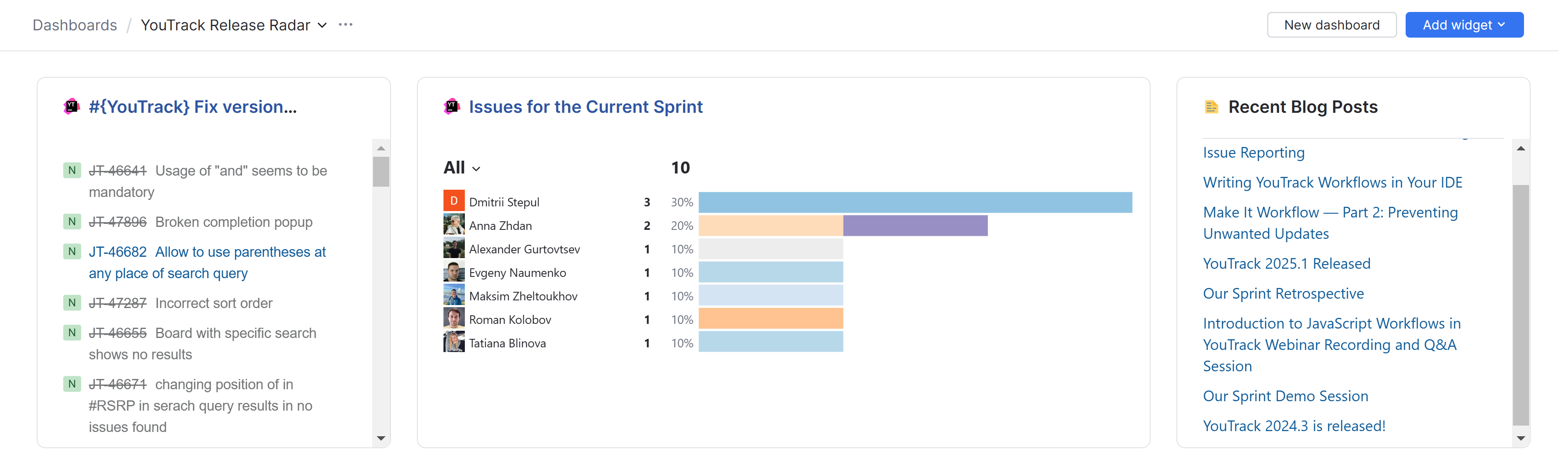 You can format your text any way you want, add images, and insert links to other resources. The YouTrack Dashboard lets you format text in Markdown — the same markup that is used to format text in issue descriptions and comments. For details, see Markdown Syntax.