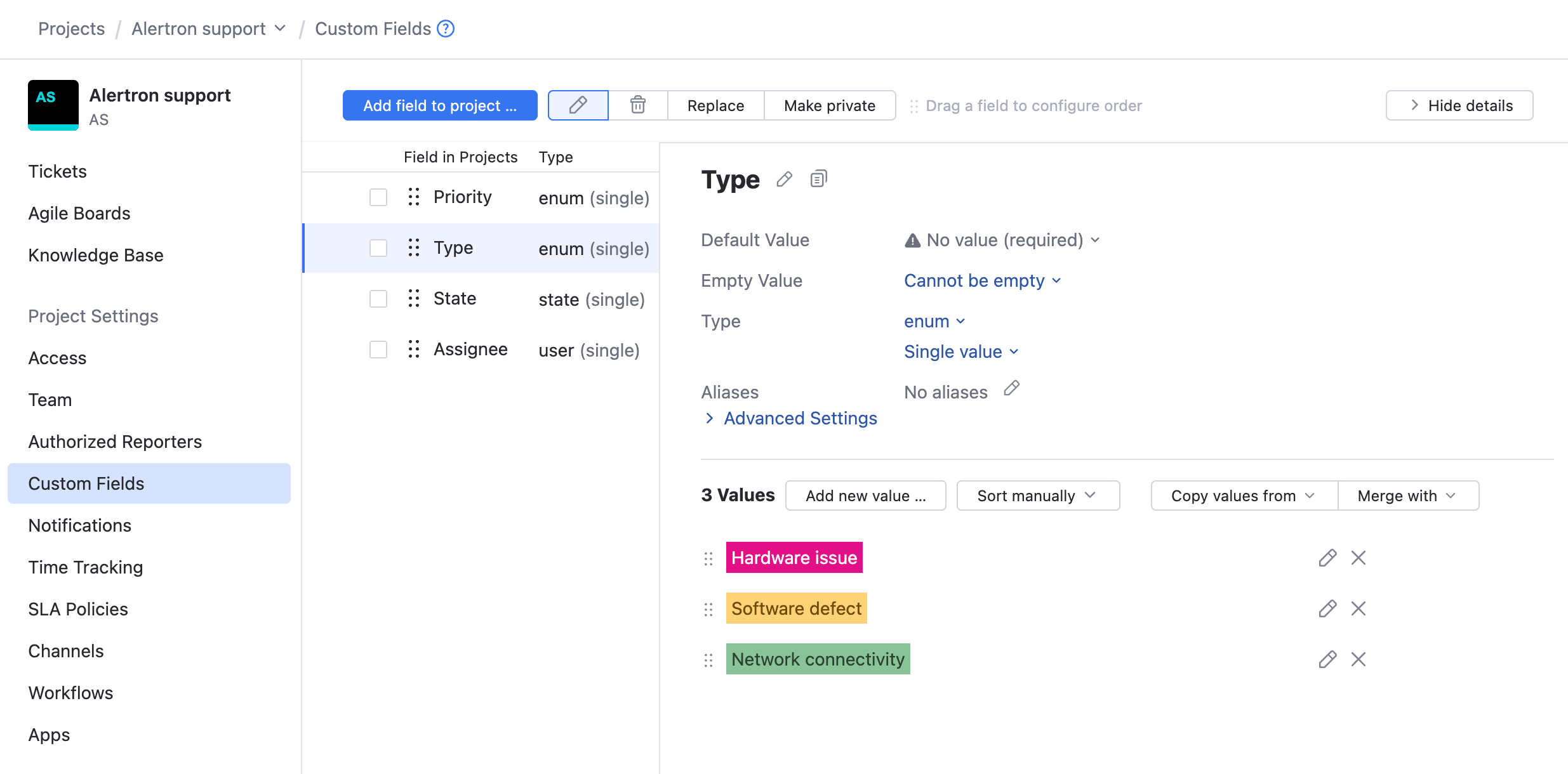 A project in YouTrack serves as a central hub for working toward a specific goal. There are several configuration options available at the project level that help to focus your team's effort and adapt it to meet your requirements. You can use a helpdesk project to cover a range of use cases, including: