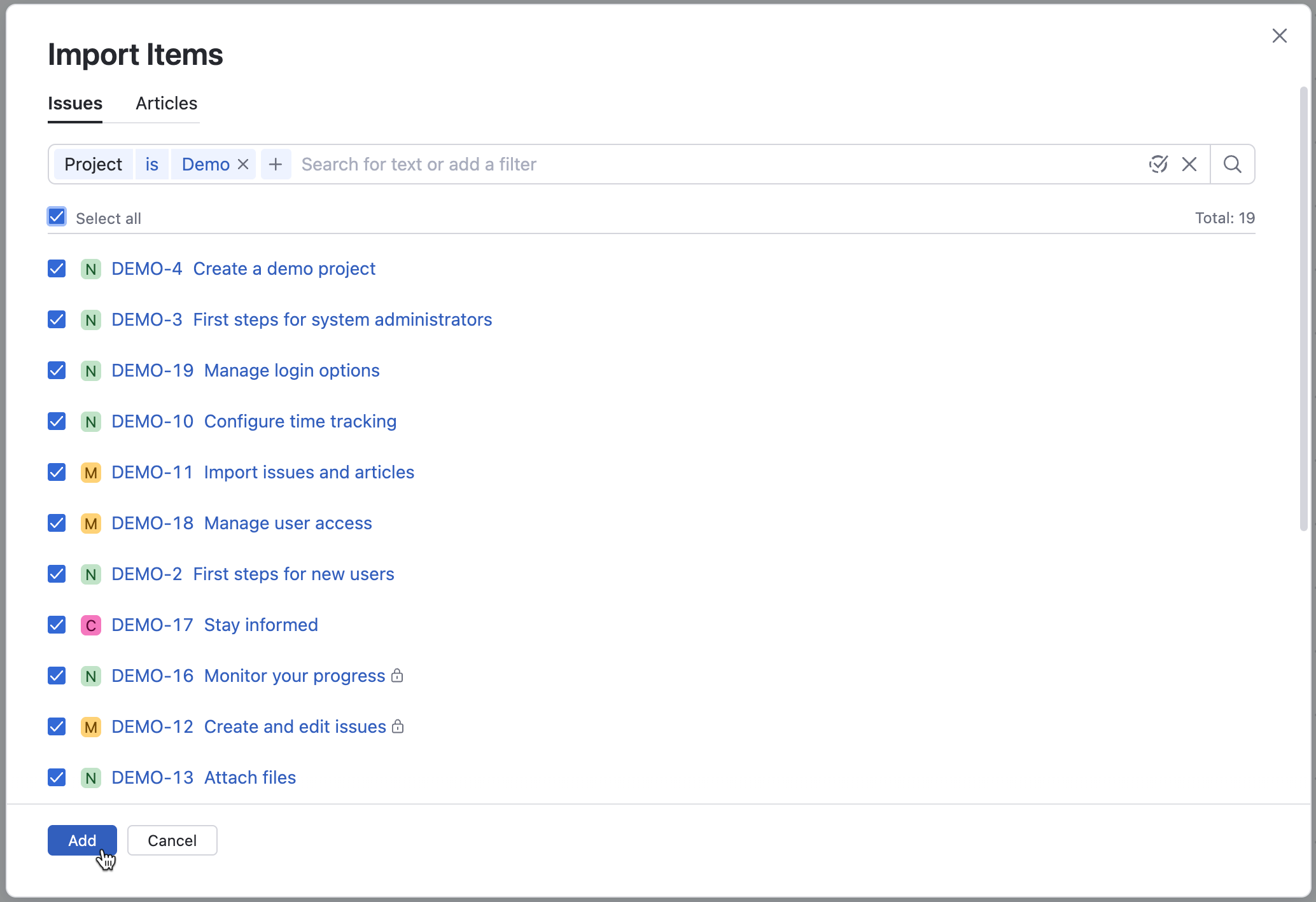 The Add Items list only displays issues and articles that you have permission to view, ensuring access remains limited to authorized items.