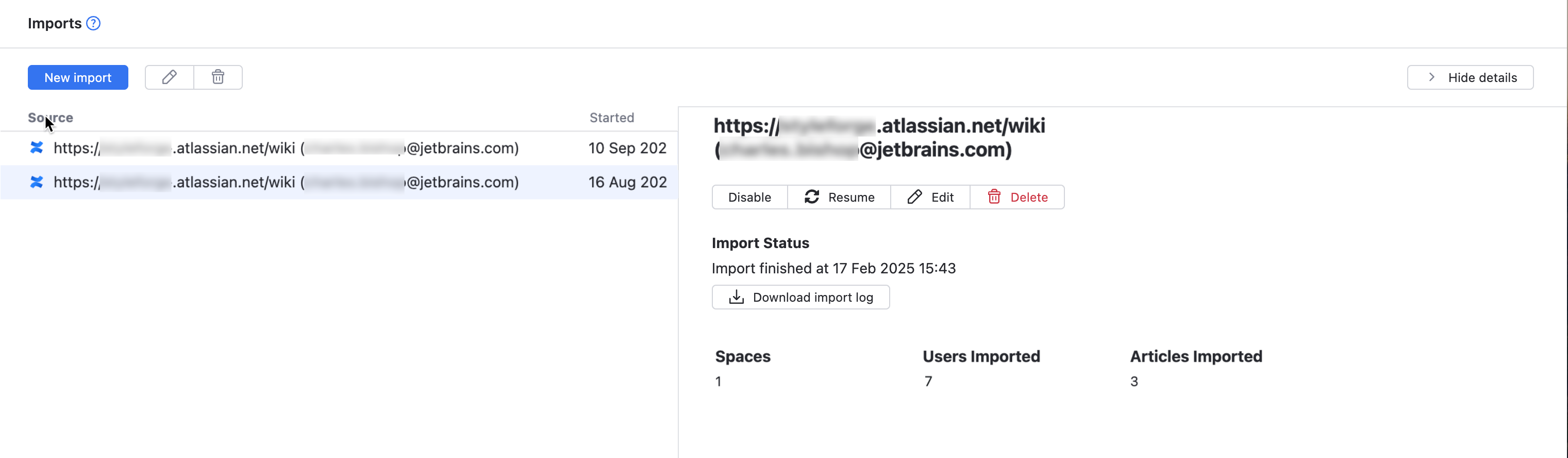 Delete | Deletes the current import settings. Projects, articles, comments, users, and groups that were imported from the connected Confluence instance are not affected. If you delete the import settings and connect to the same Confluence instance, the articles are re-imported into existing projects with new IDs. |
