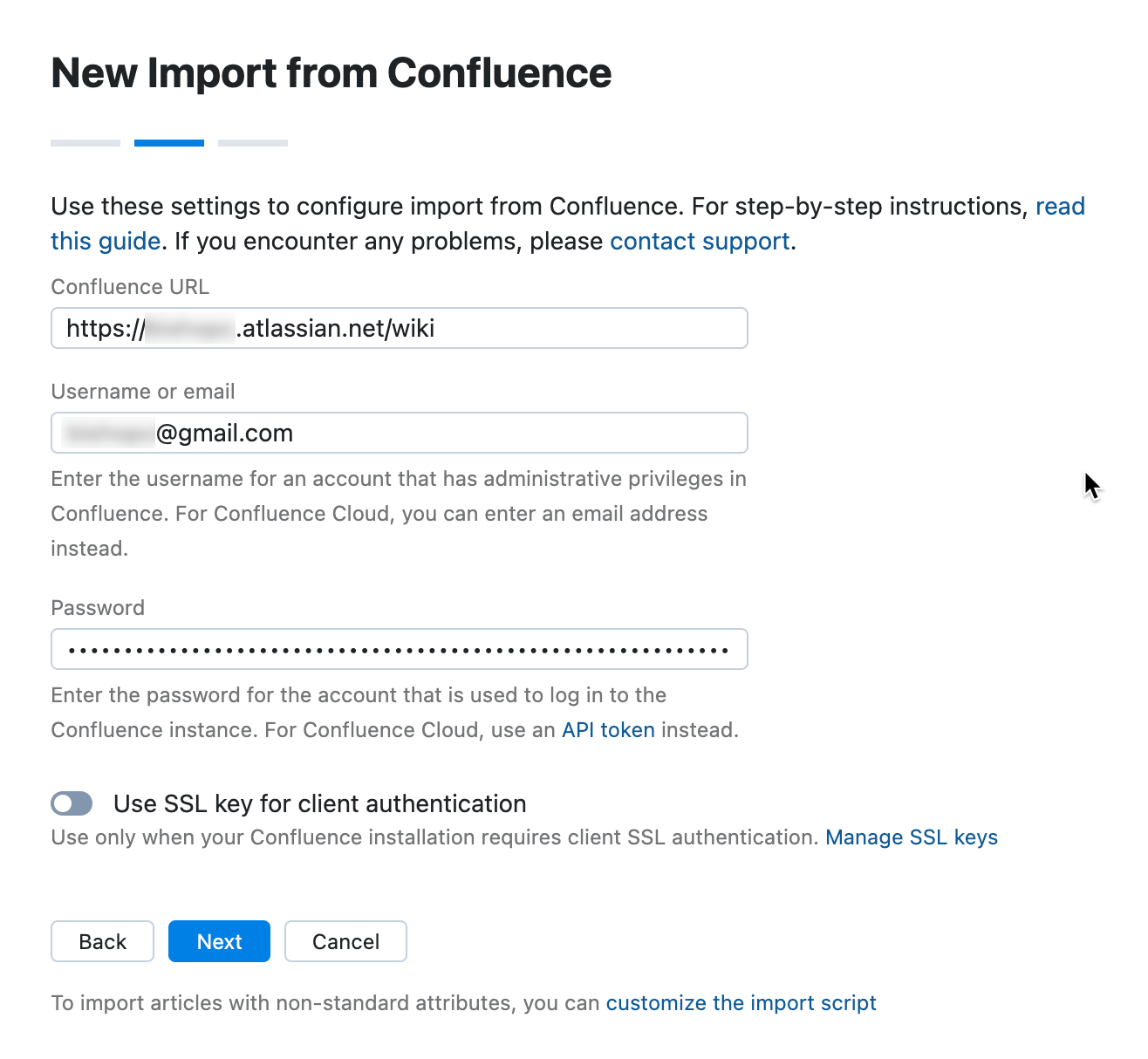 To configure an import from Confluence Cloud, you will need an API token. For details on creating an API token, see Create an API Token for Confluence Cloud.