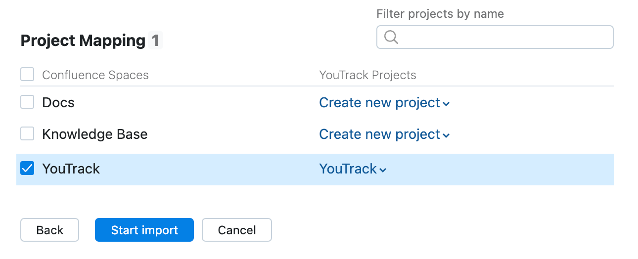 Select the Confluence spaces and target projects for import. For details, see Project Mapping.
