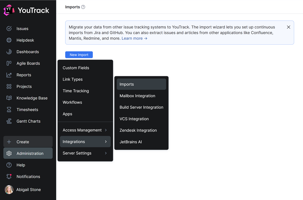 The import wizard lets you set up continuous imports from Jira, GitHub, GitLab, monday.com, and Zendesk. You can also extract issues from other trackers like Mantis, Redmine, and more.