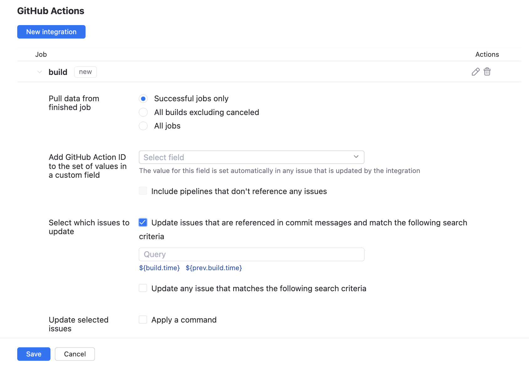Add GitHub Action ID to the set of values in a custom field | Determines which custom field is populated with build numbers in the integrated YouTrack project. The selection is restricted to custom fields that store a As GitHub Actions operate with pipelines instead of builds, YouTrack stores pipeline IDs instead of build numbers as custom field values. The value for the selected field is set automatically in any issue updated by the integration. The settings in the Select which issues to update section of the integration determine which issues are assigned build numbers. The following option is available: