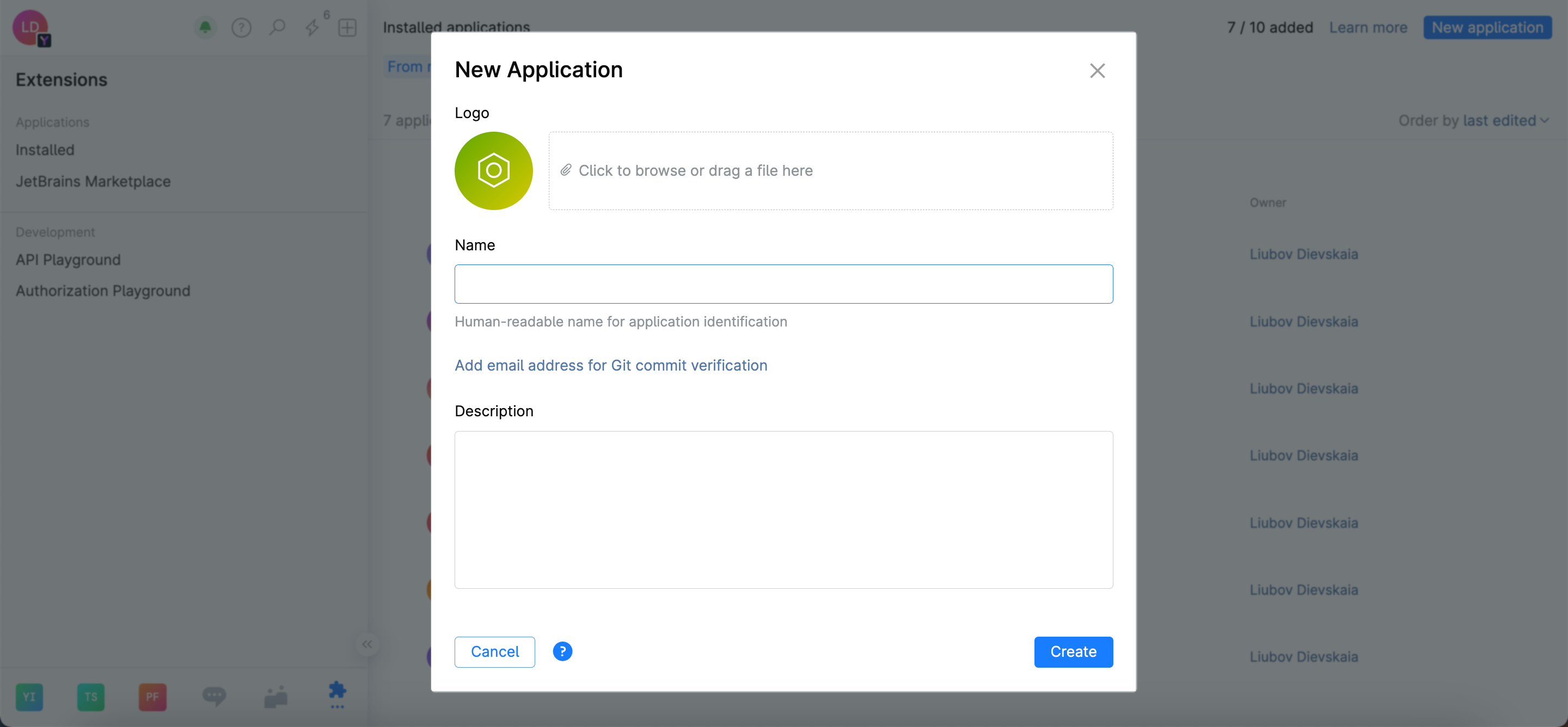 Give your application a unique name and click the Create button.
