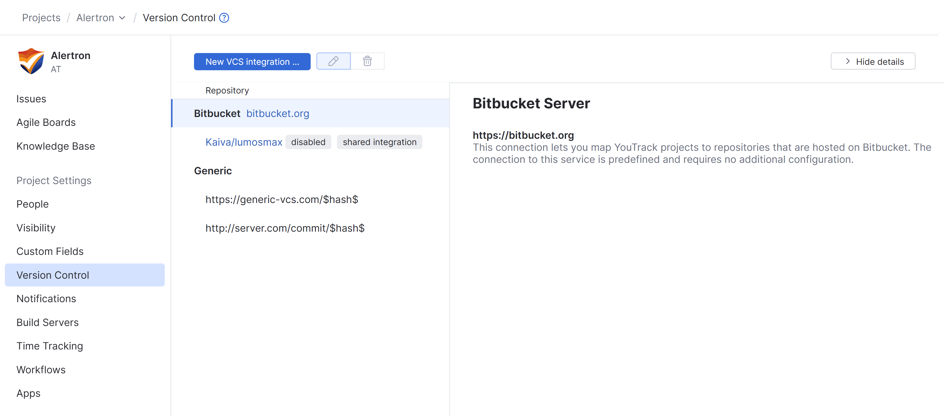 Integrate your YouTrack project with a repository in a self-hosted Bitbucket Server. | |