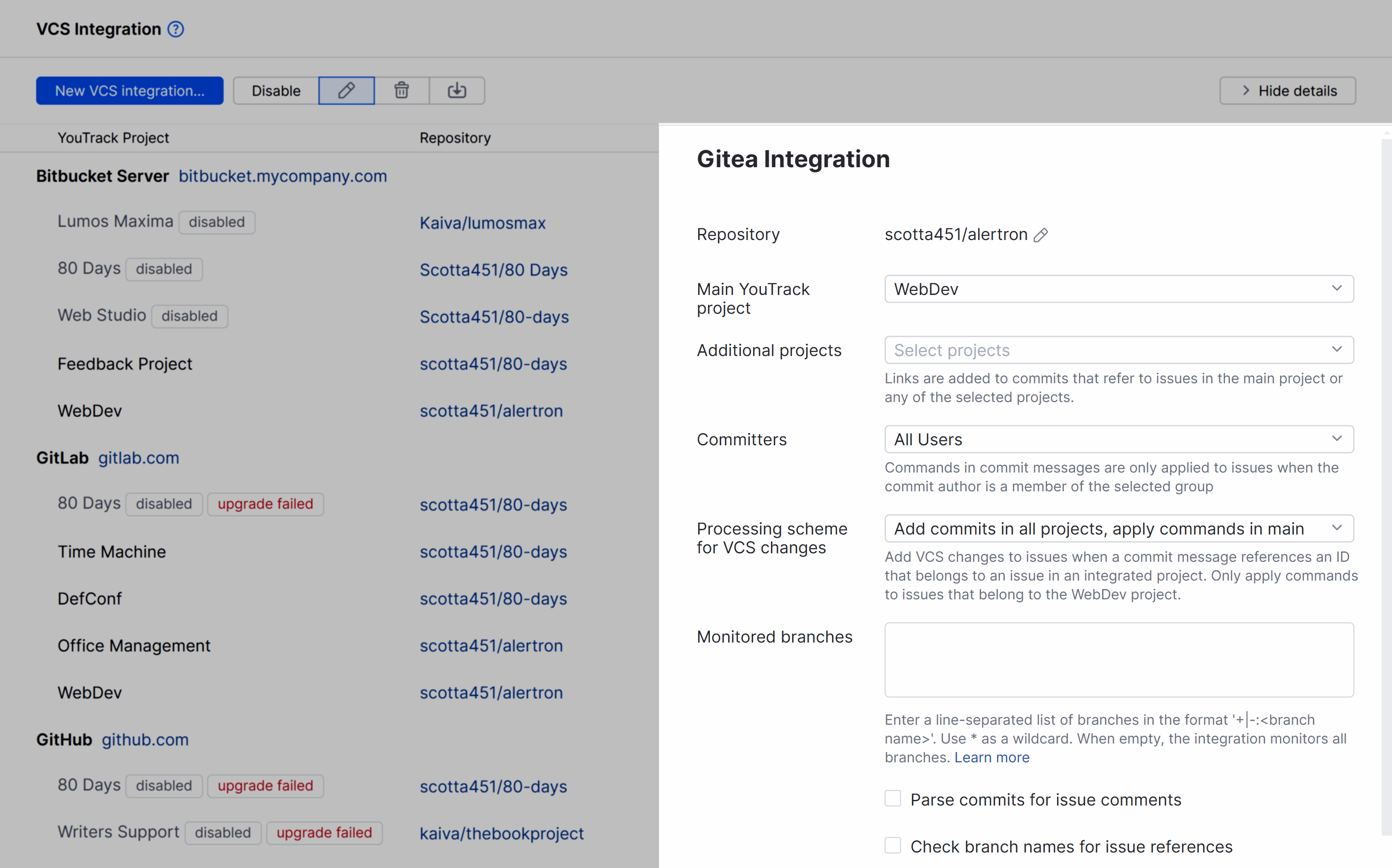 If you only want to process changes by specific users in designated branches or restrict the visibility of VCS changes in YouTrack, you can customize the integration settings. Use the following settings to customize the integration: