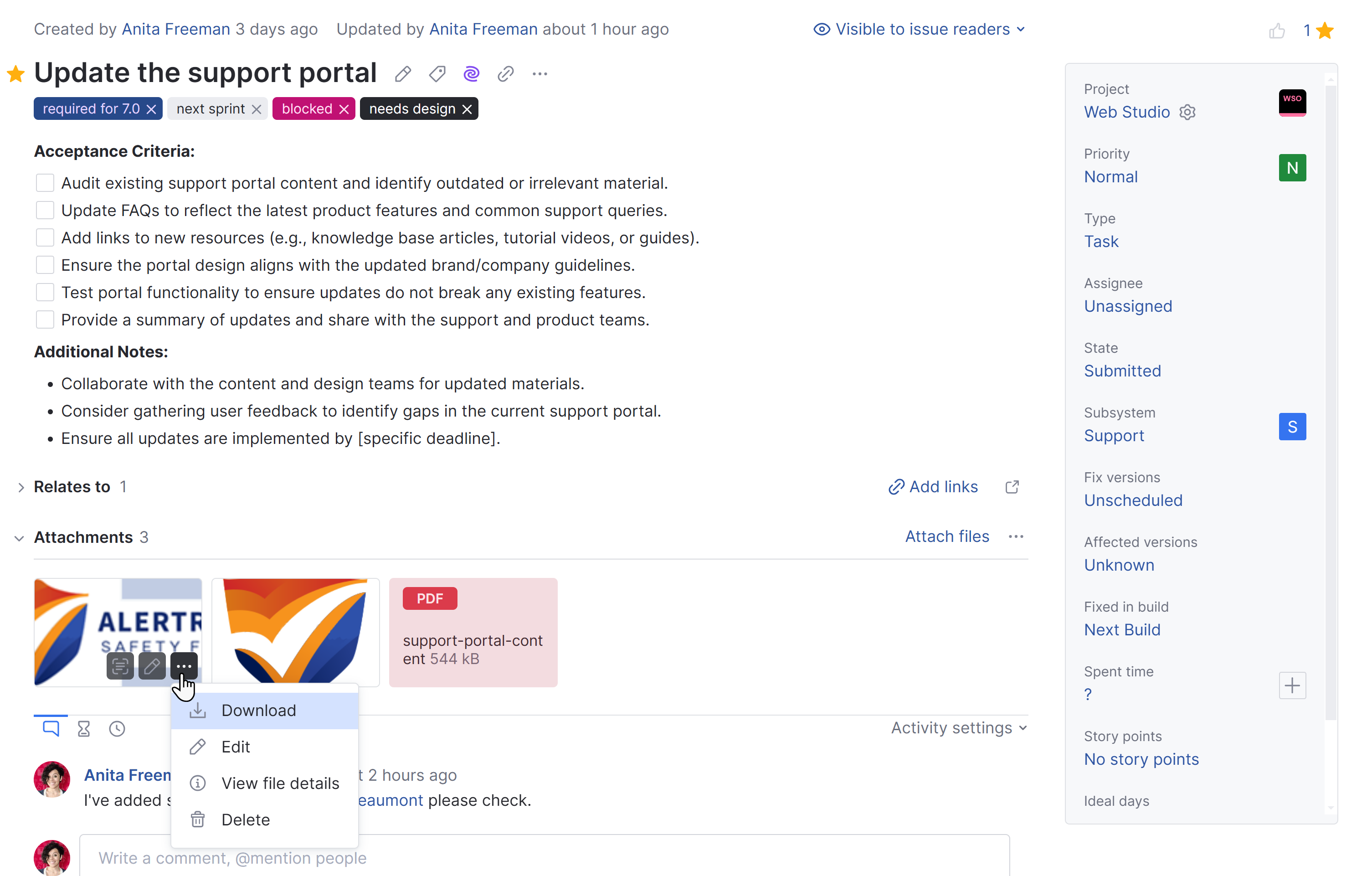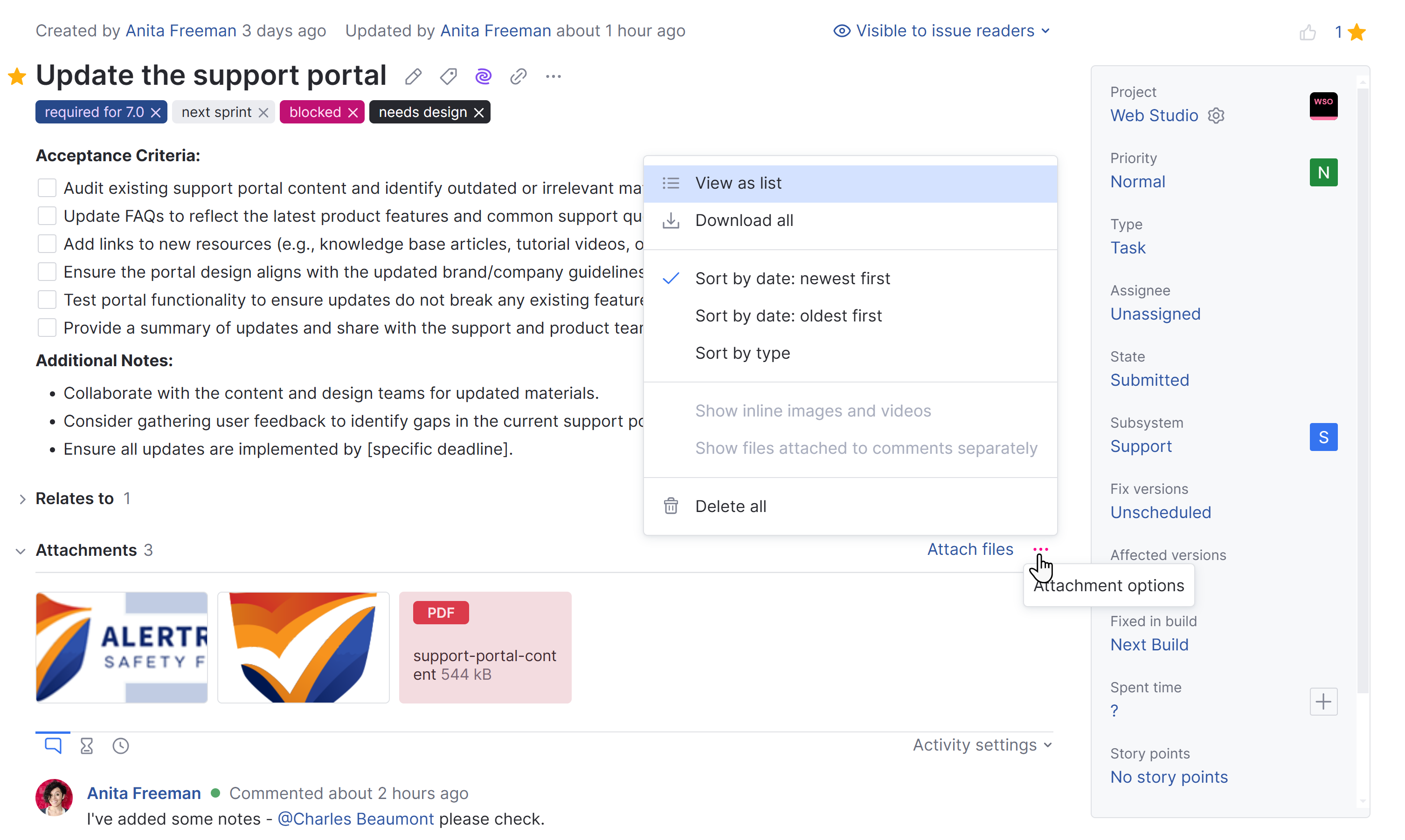 To attach new files to an issue, you can use one of the attachment options from the Show more menu or simply drag files from your local directory to the section of the page that displays the issue description.
