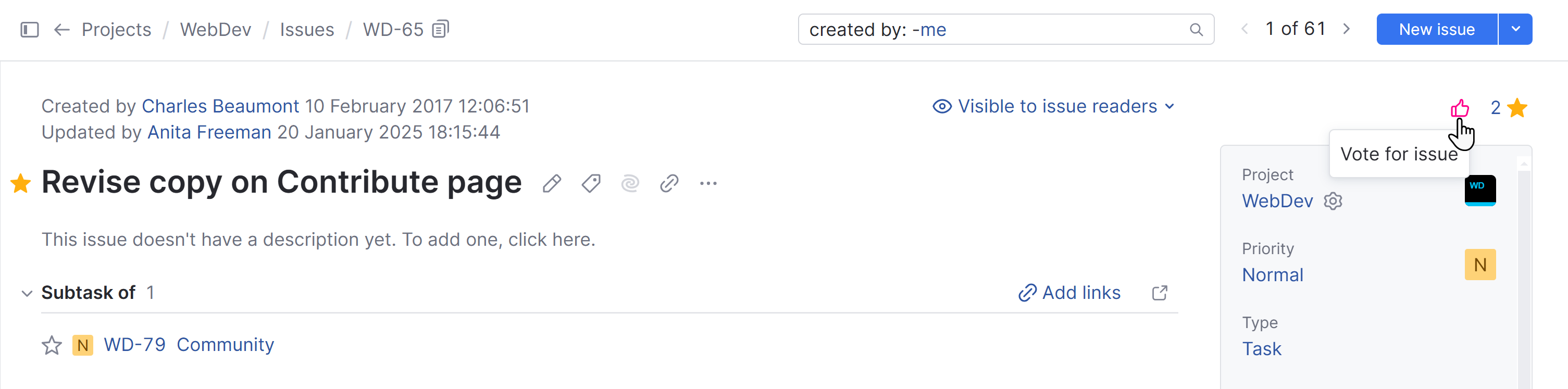 When an issue has one or more votes, a counter is shown to the left of the Vote icon. Click the counter to show the list of users who have voted for the issue.