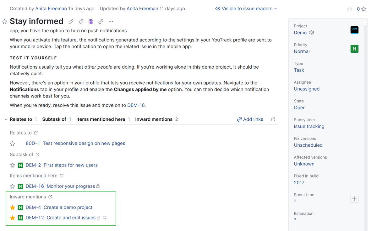 In addition to the links that can be added to issues, links are added automatically any time you reference a target issue. These "mentions" help you find and follow references posted in descriptions, comments, and work items.