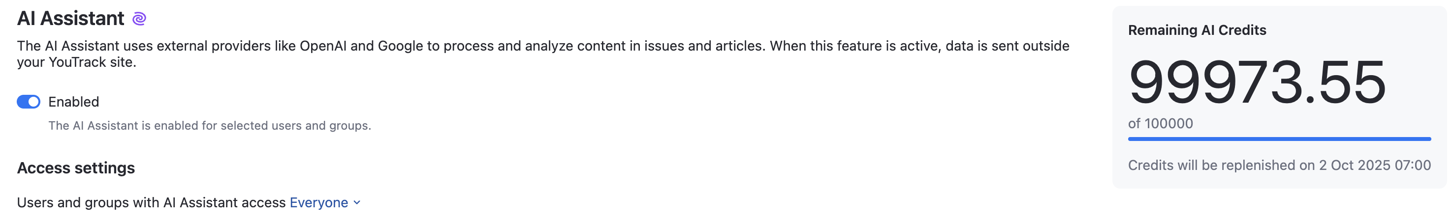 Your YouTrack site is allocated a fixed number of free credits for working with the JetBrains AI service. Each interaction with the AI Assistant in YouTrack consumes one credit. These credits are refreshed on a weekly basis.
