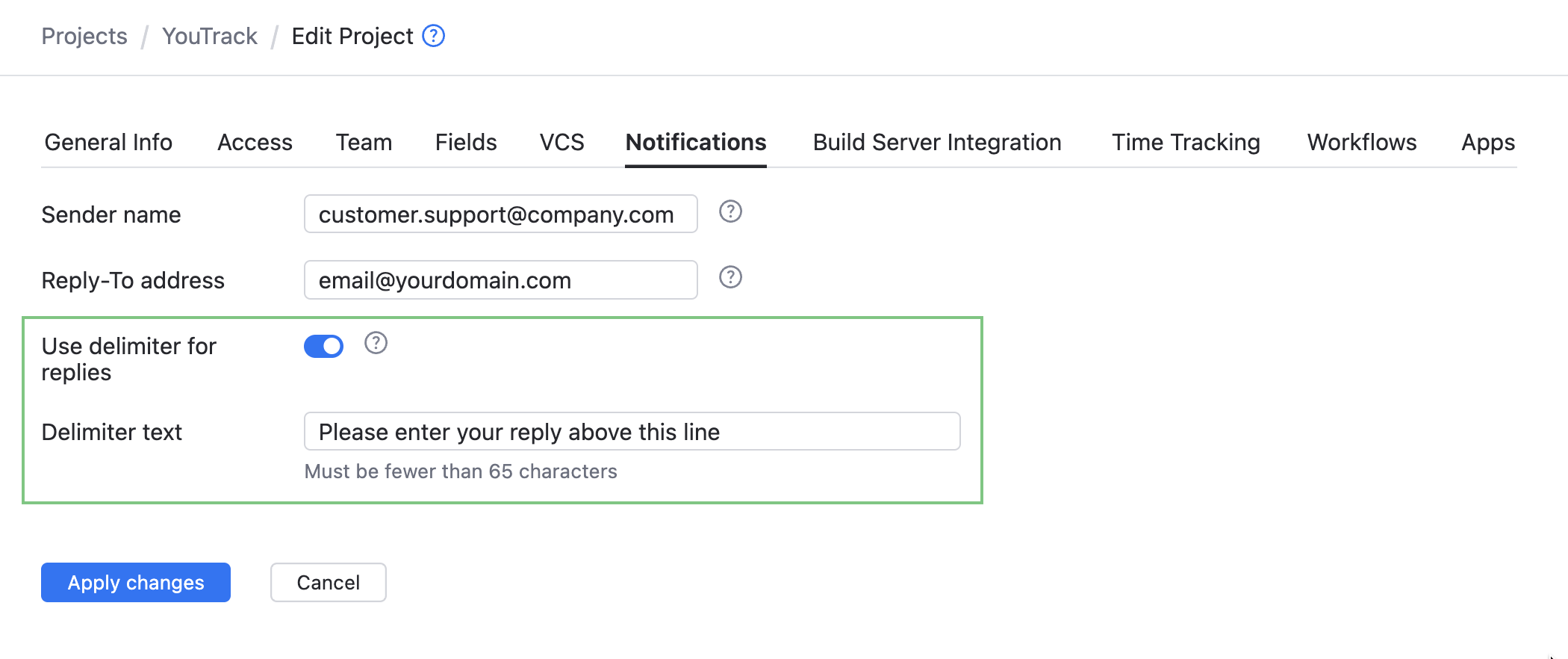 When you are done setting up mailbox integration for the project, YouTrack automatically enables a default delimiter for the replies. It helps the mailbox integration transform replies into comments with greater precision.