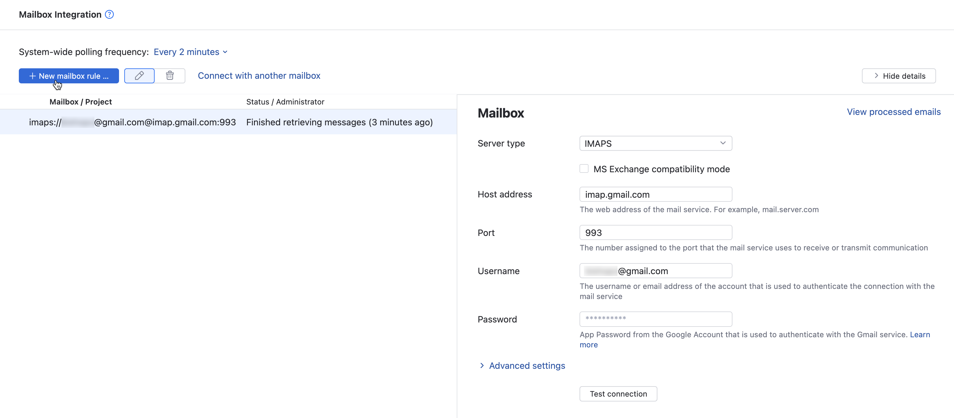 Before you can enable a mailbox integration for a specific project, you need to have set up a connection to process incoming email messages from at least one mail server. For specific instructions, see Enable the Mailbox Integration.