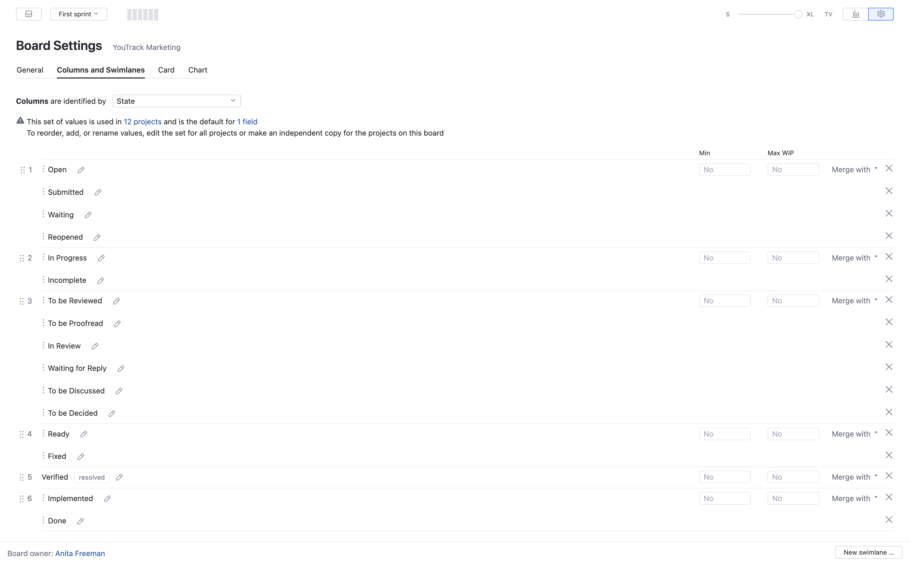 Columns are identified by values from the State field, which is used in all the projects that are managed on this board. However, many of these projects use a custom set of values for this field. To configure your columns as shown here: