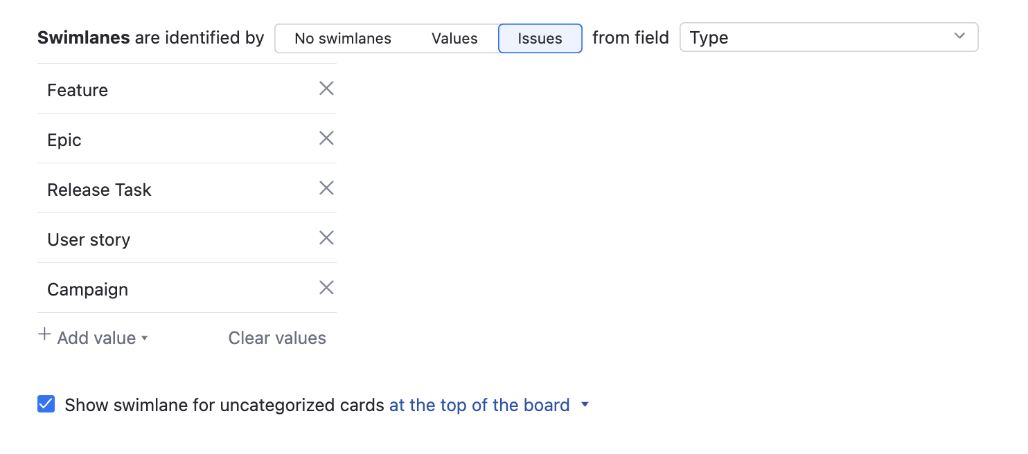 Most of the swimlanes are identified by issues that are assigned the Epic value in the Type field. This board is configured to identify parent issues in other projects as swimlanes as well. These projects use the values Feature, Meta Issue, Campaign, or User story.