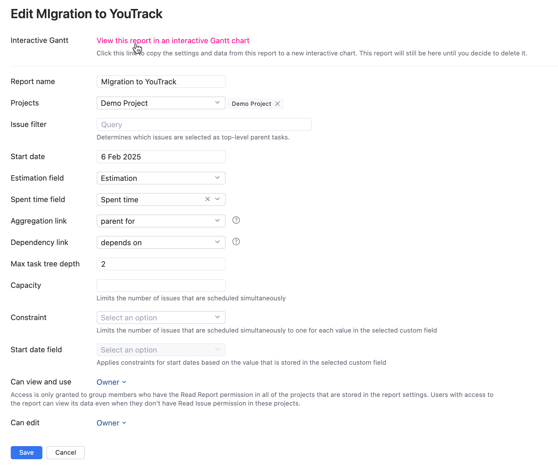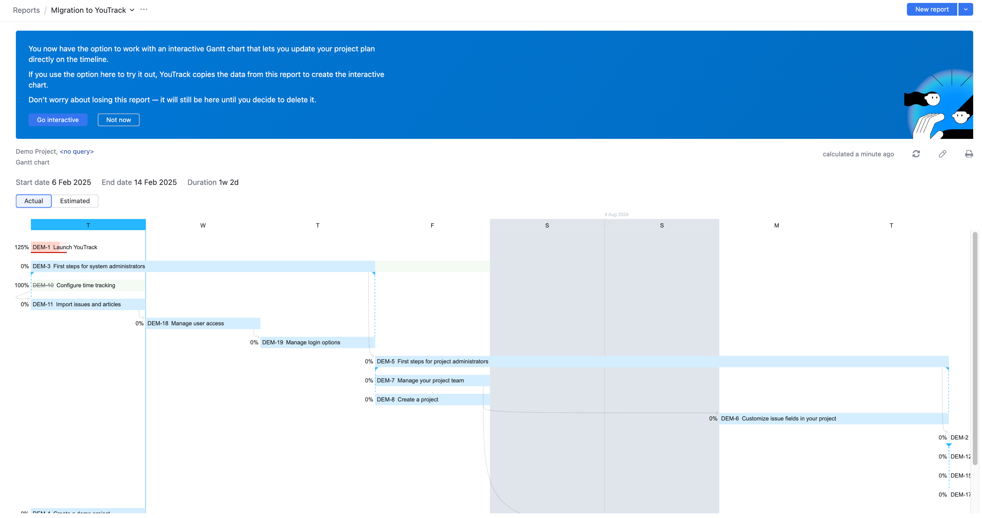 Gantt charts in YouTrack are also available as a static report. This report generates a Gantt chart based on the underlying data that is stored in each of the issues that match the report filter.