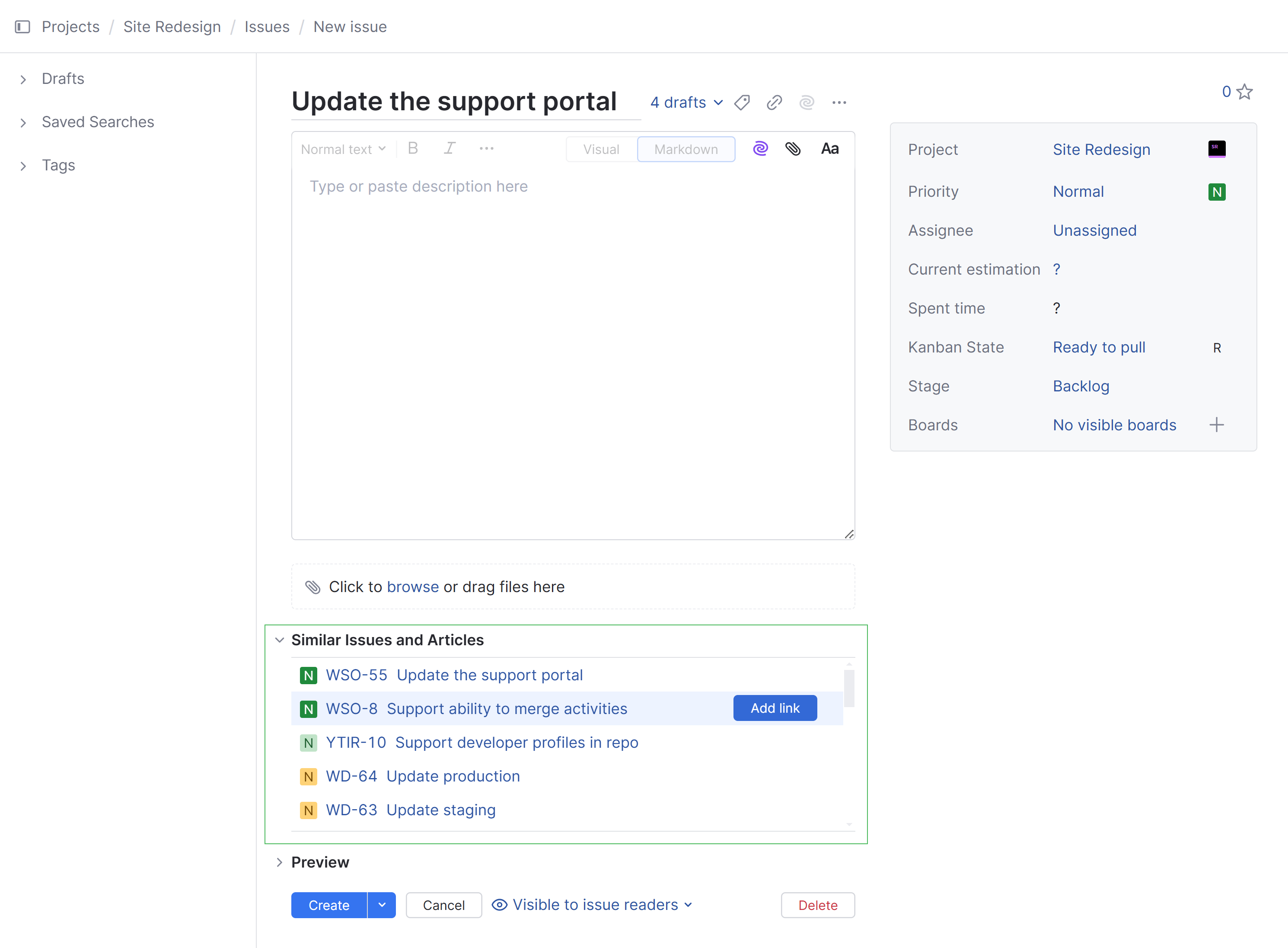 If the issue that you want to create is somehow related to other issues that already exist in YouTrack, you can add links to your issue draft.