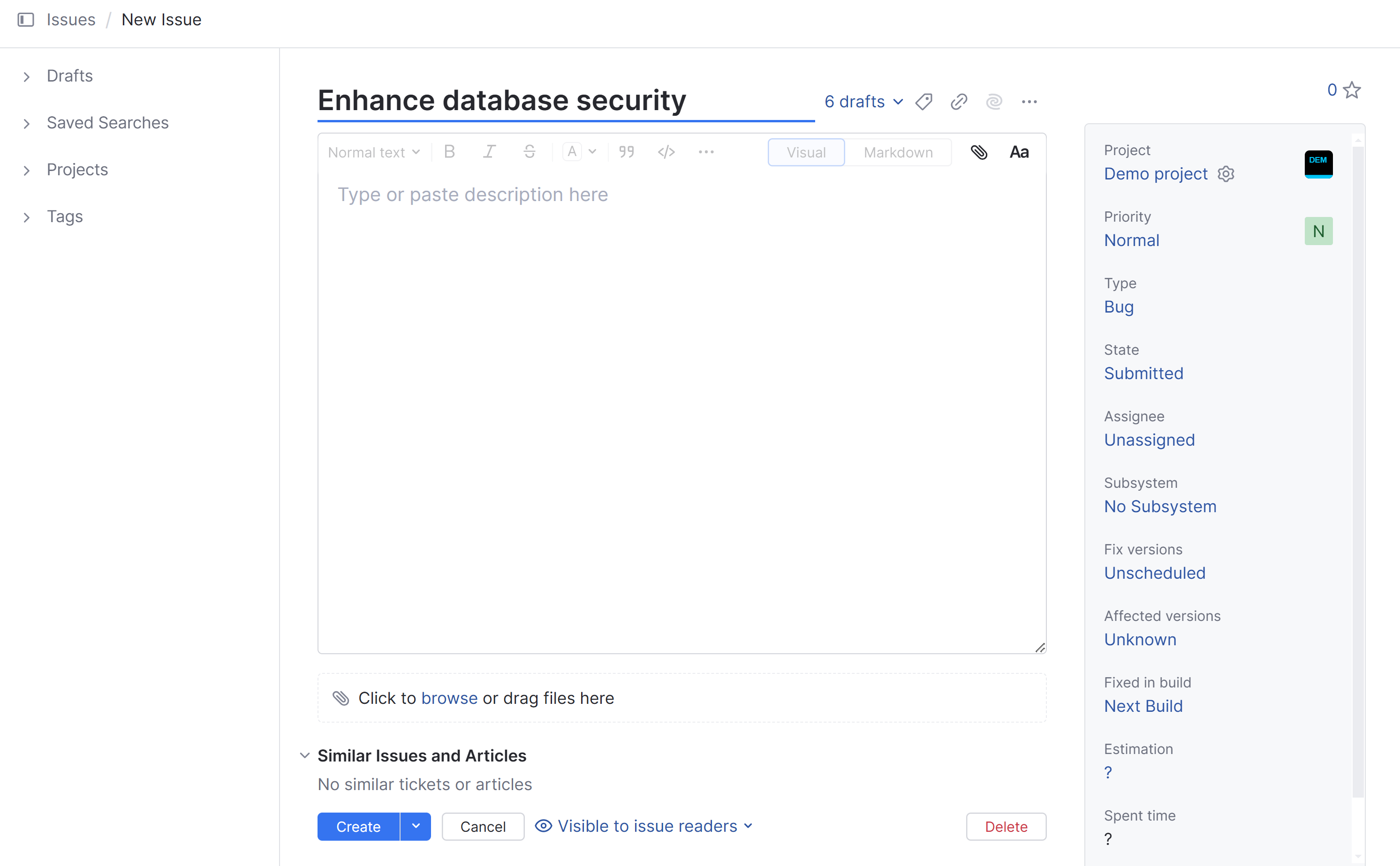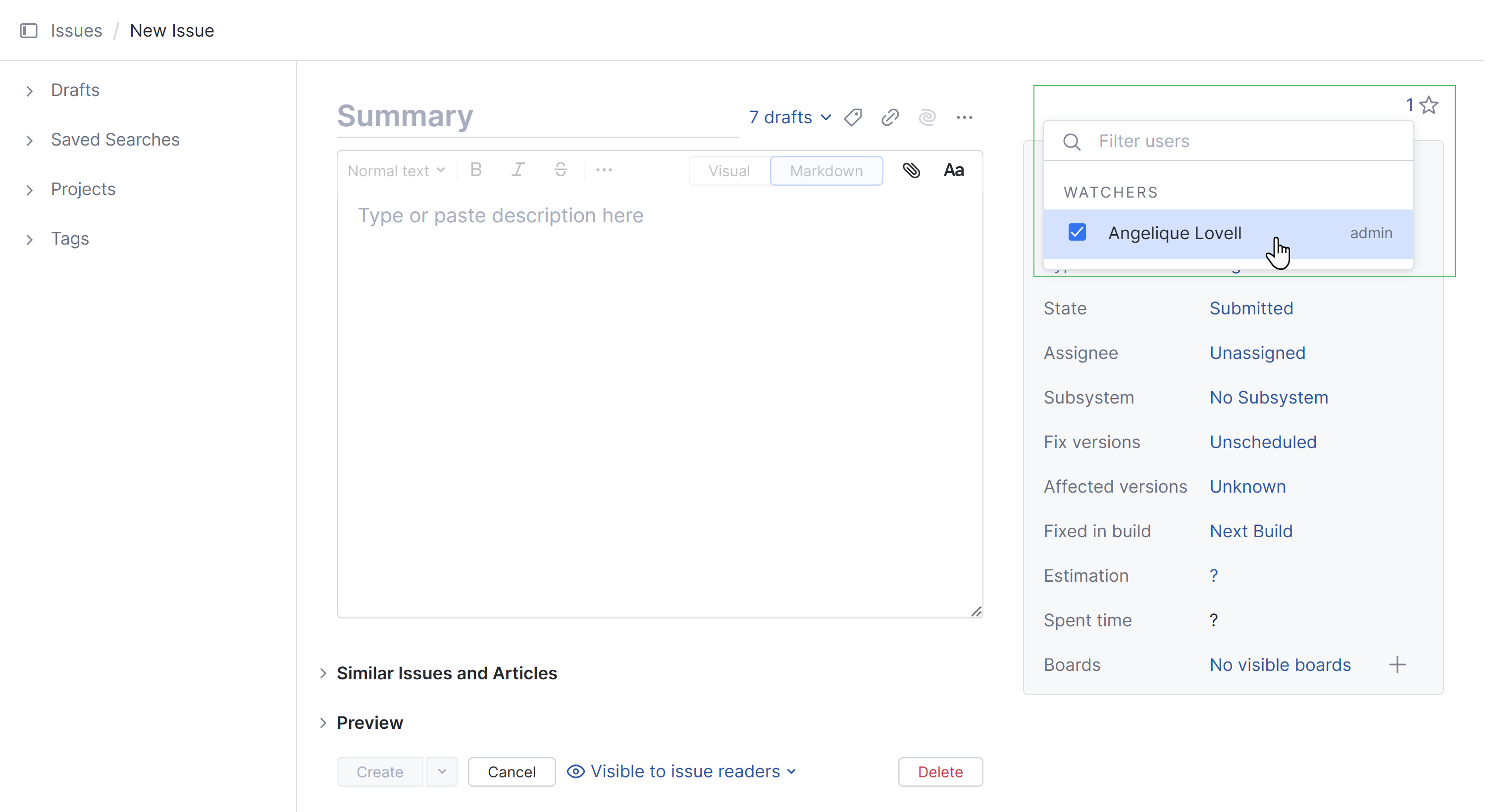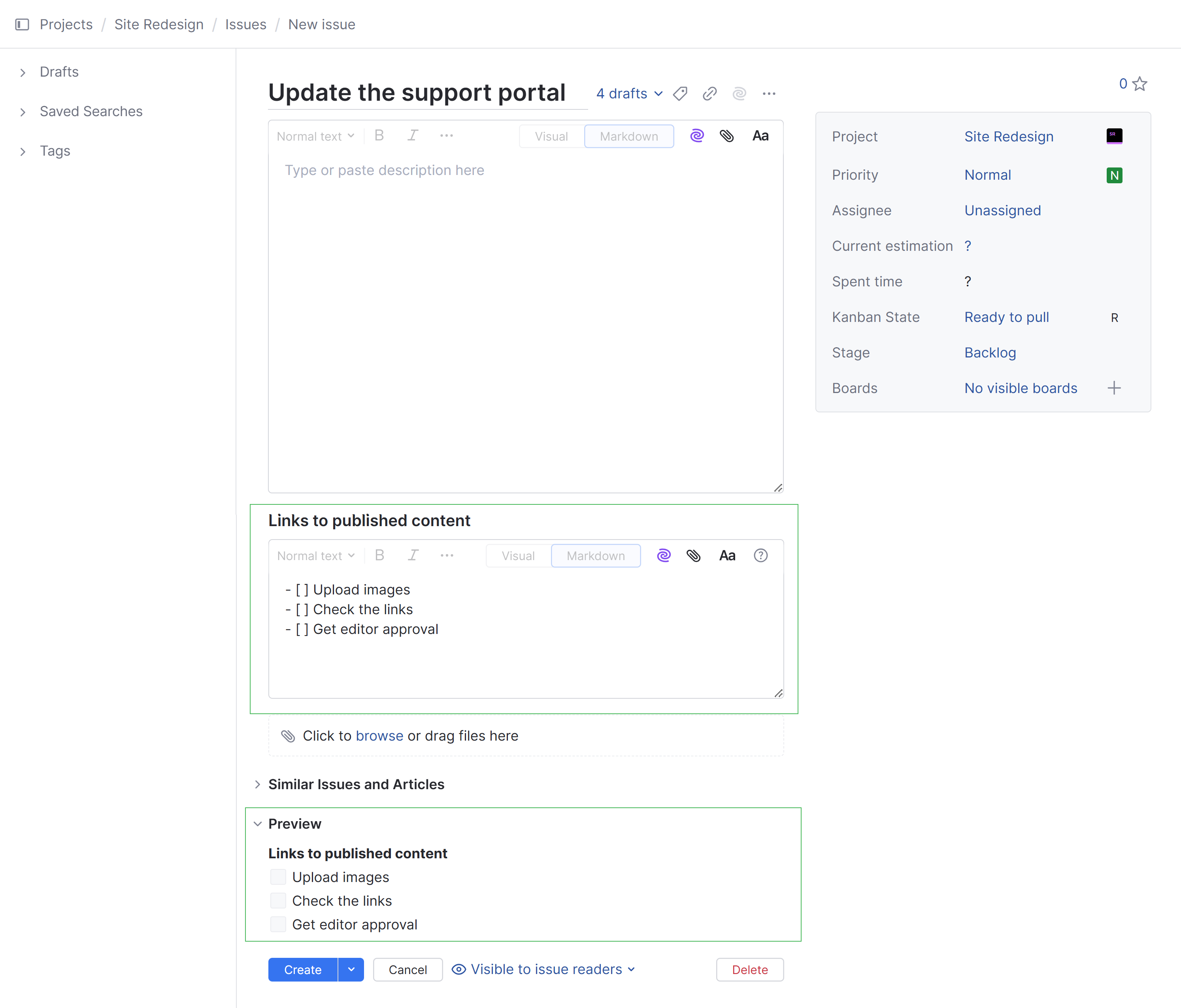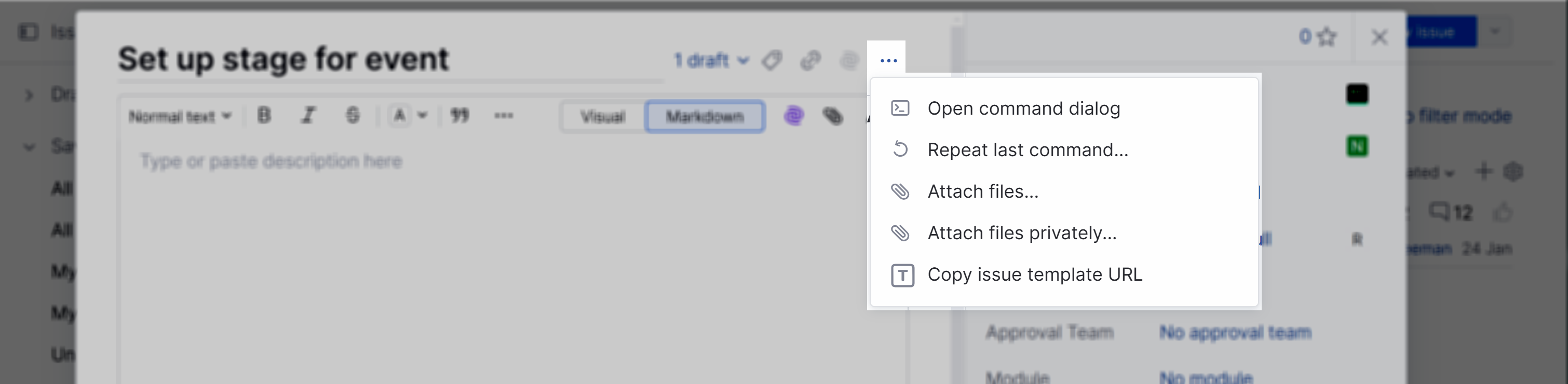The rich text editor lets you format the issue description text in Visual or Markdown mode.