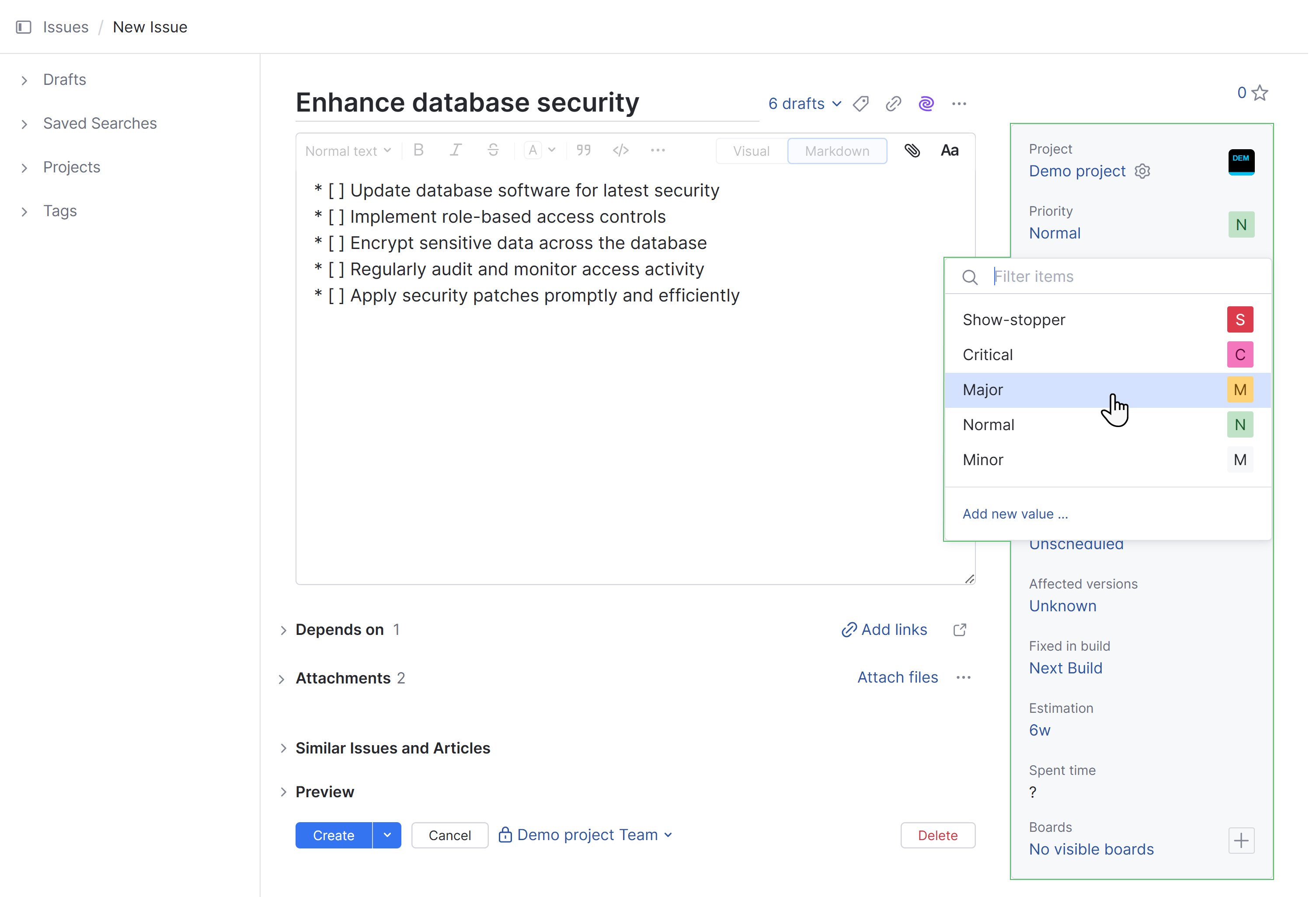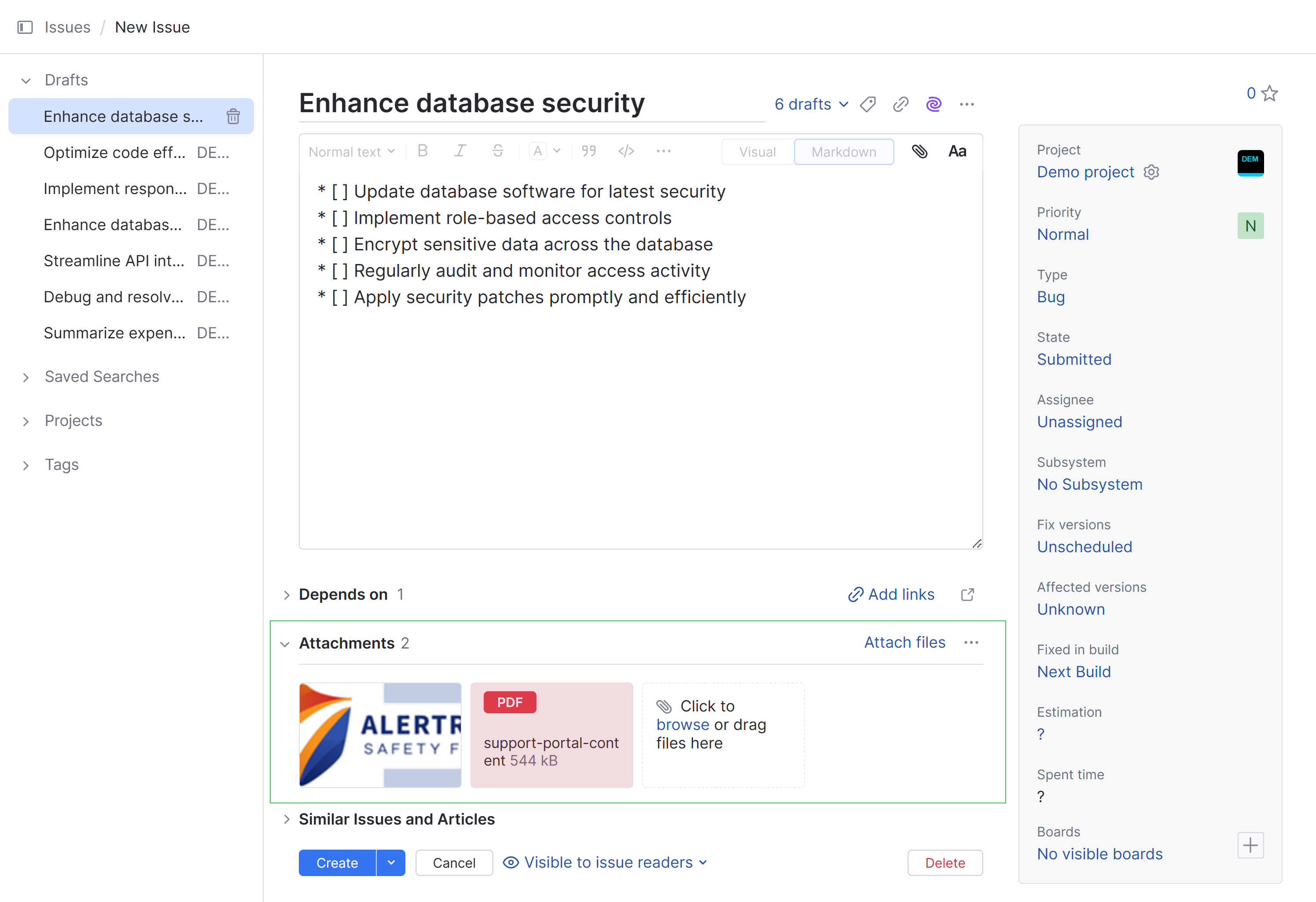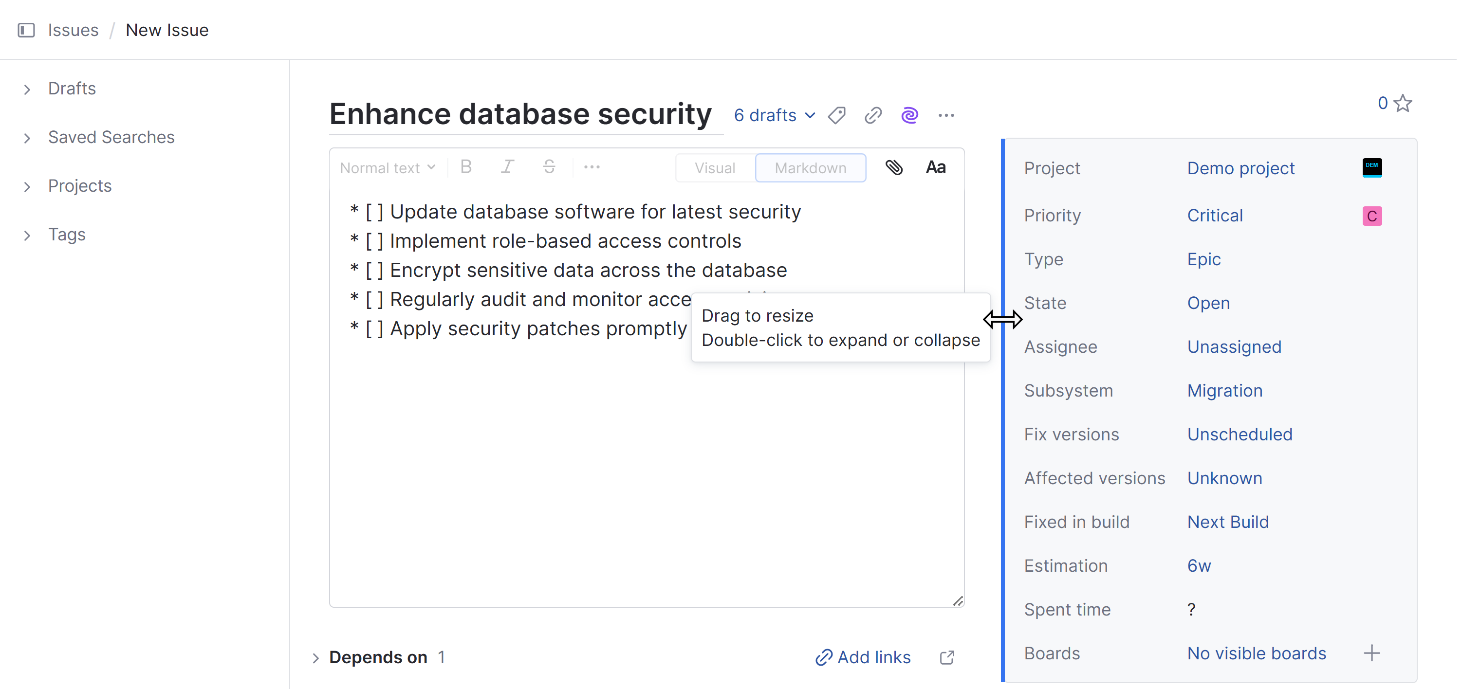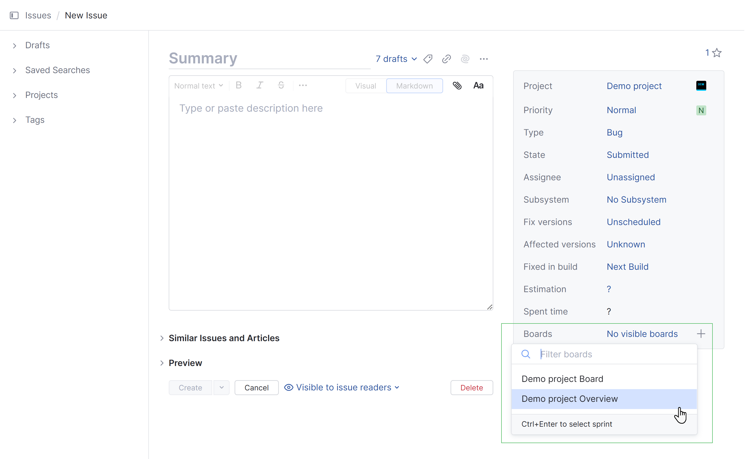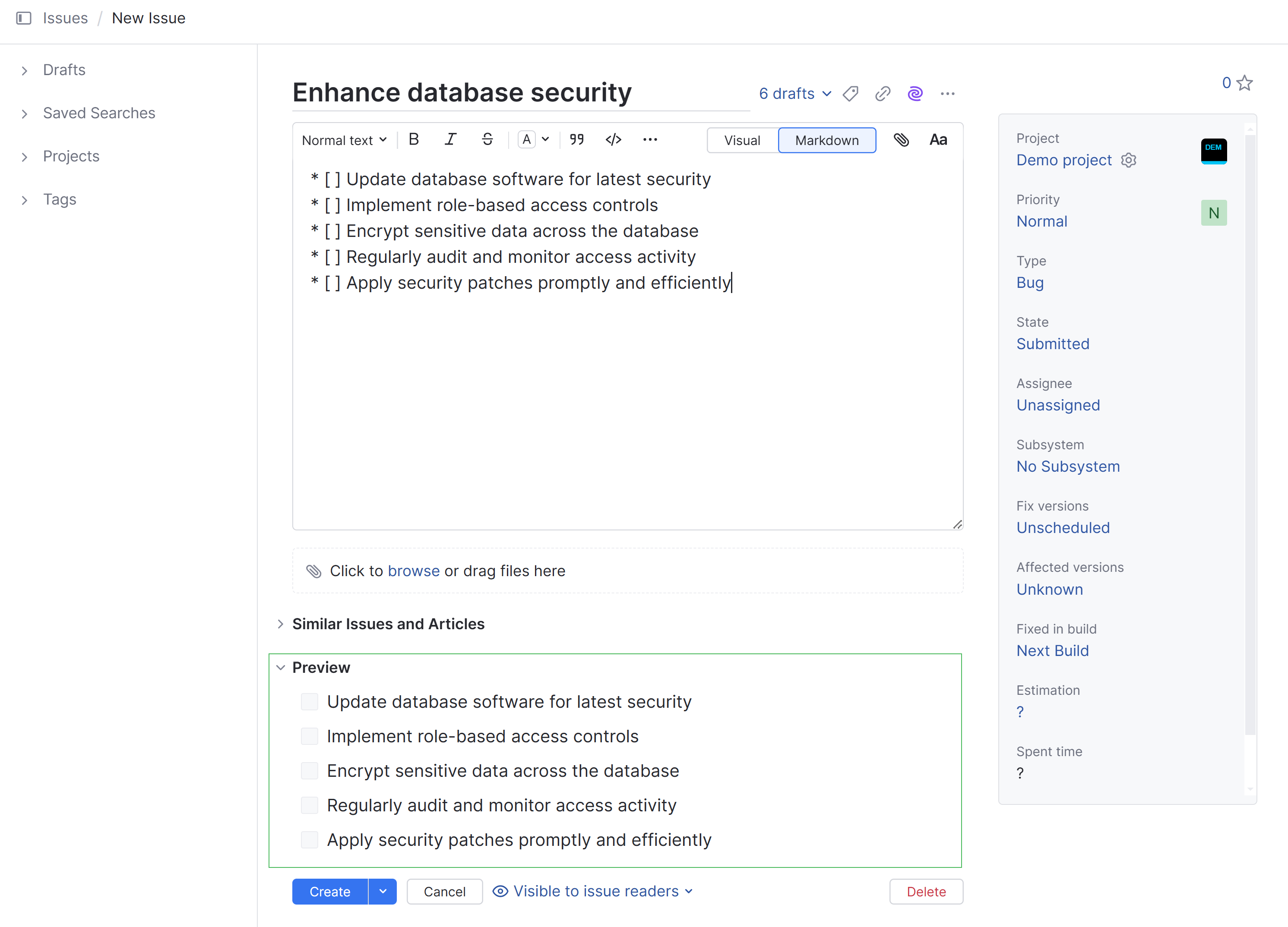 The rich text editor lets you format the issue description text in Visual or Markdown mode.