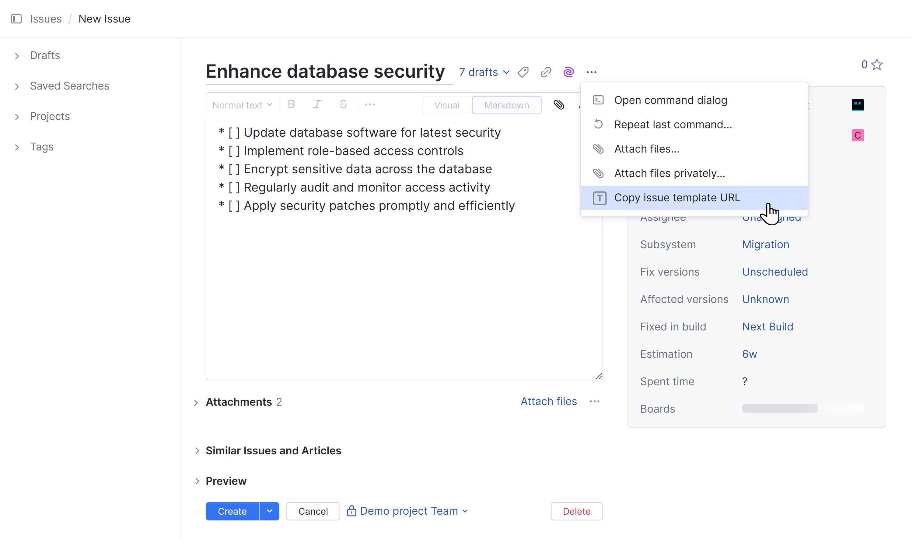 Copy issue template URL | Generates a URL with the data that you've already entered in the fields of the issue draft and copies this URL to the clipboard. Use this option when you want to create several issues with the same basic set of attributes or standardize issue reporting for a group of users. To learn more, see Work with Issue Templates. |